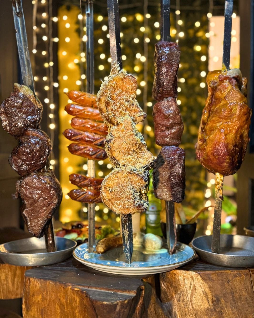 - Seguimos con la experiencia Rodizio con nuestro plato fuerte de 3 cortes de carne servido en espada y cortado en su mesa al término que el cliente escoja y acompañado con una barra de ensalada ilimitada con más de 17 opciones para armar su plato