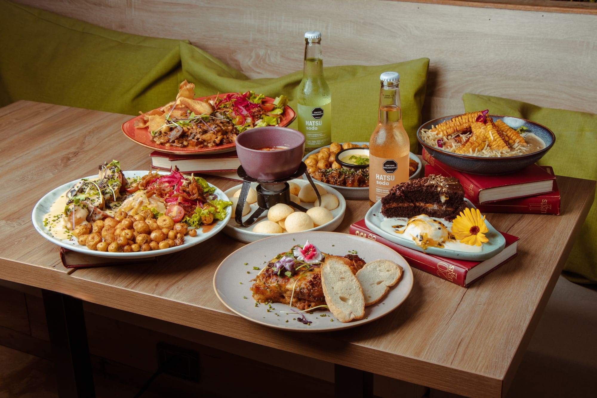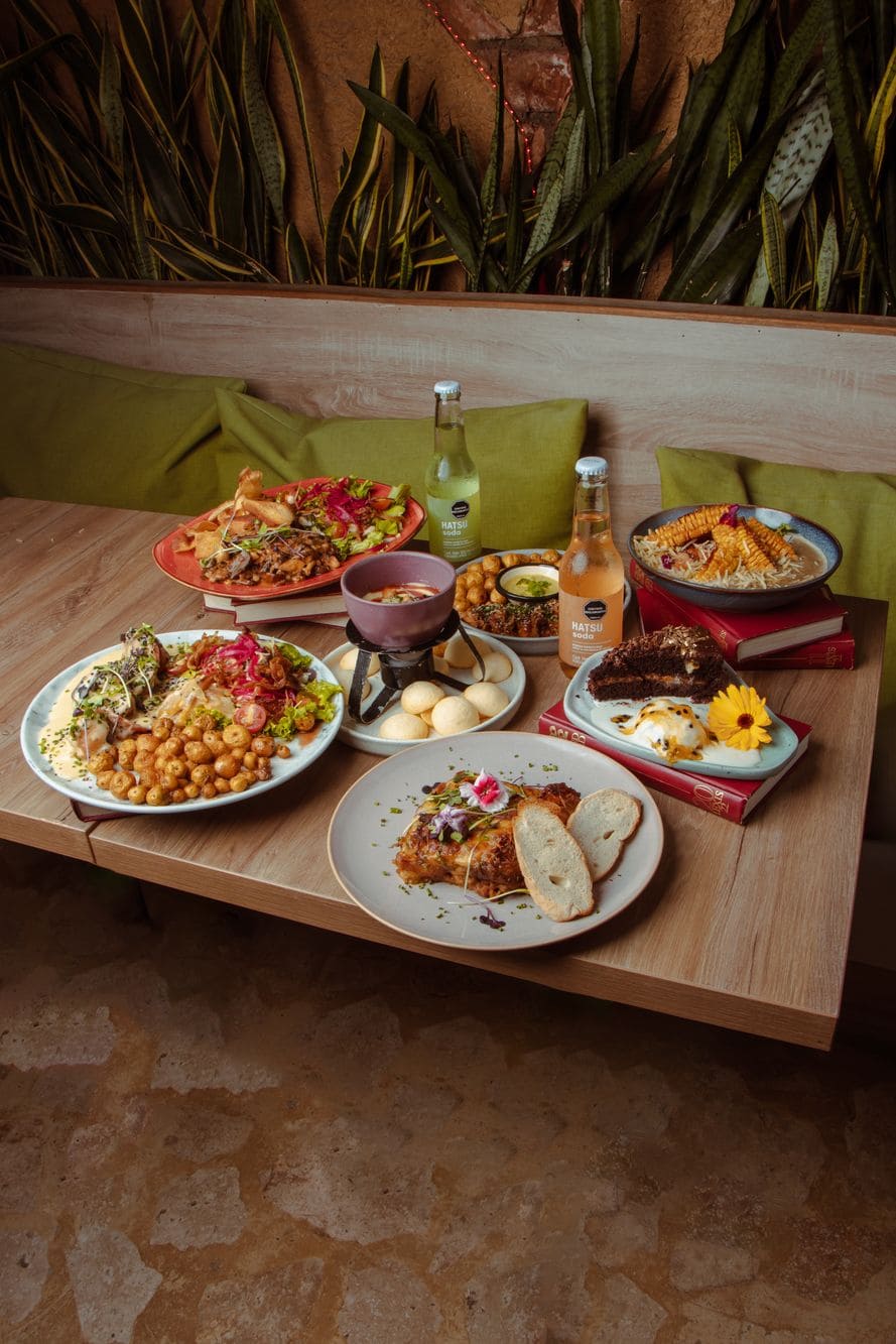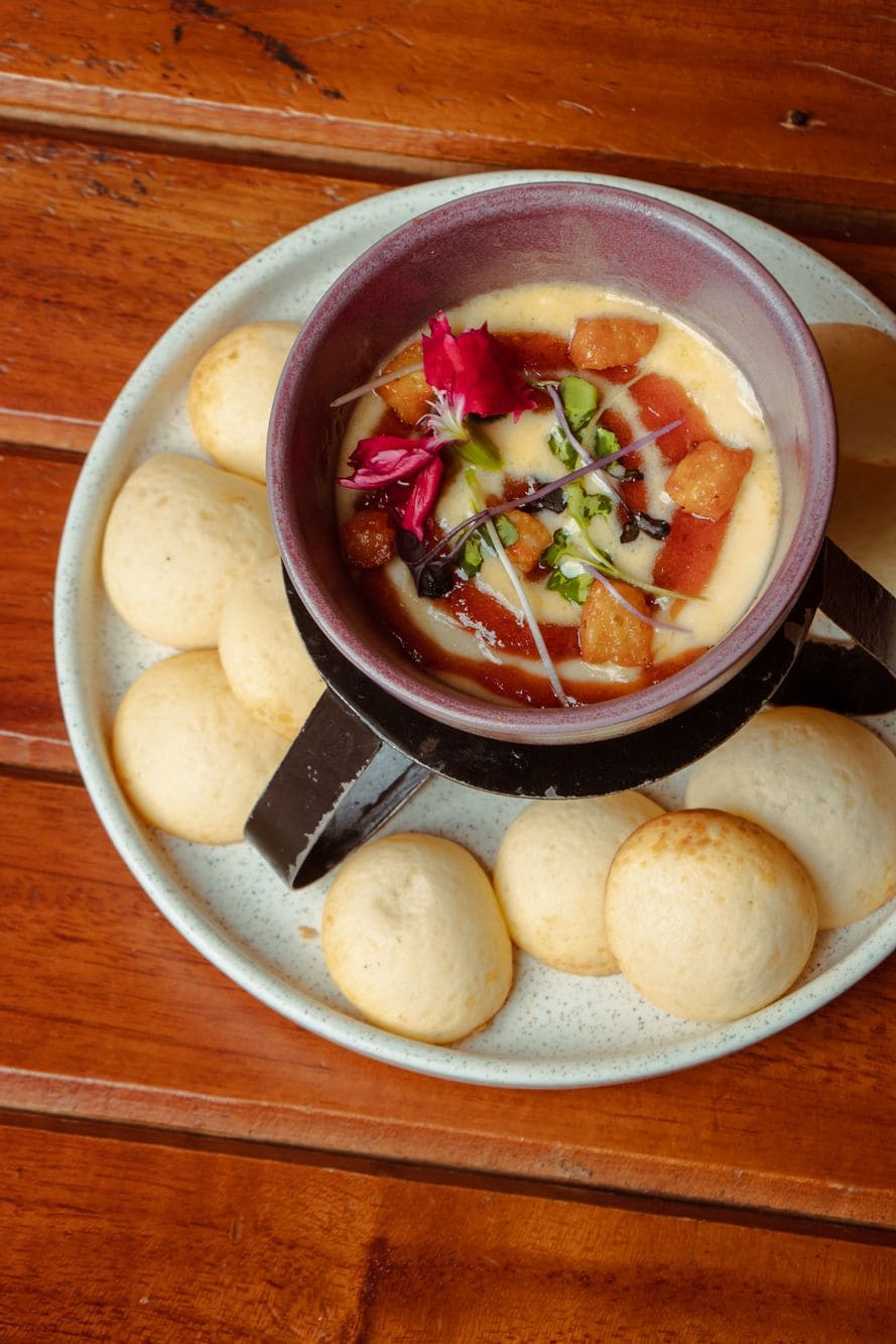 - Fondue de quesos colombianos: Queso siete cueros, queso paipa y queso costeño frito, acompañado de pandebonos y melado de guayaba con ron.