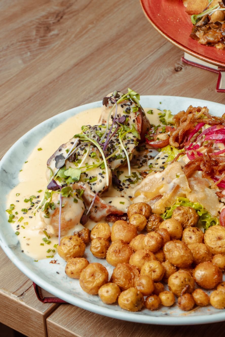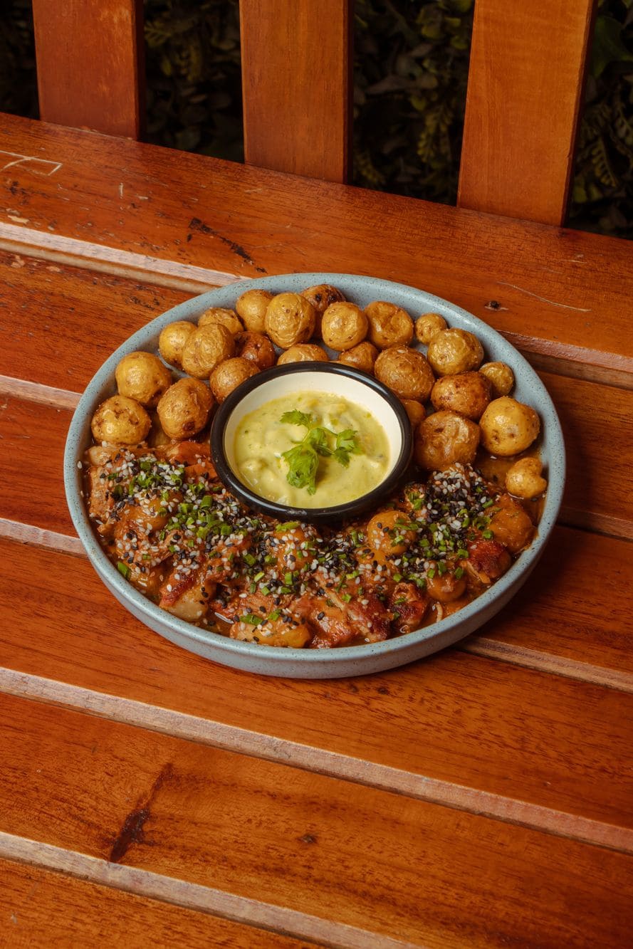 - Chicharrón confitado: Chicharrón carnudo, bañado en salsa teriyaki de uchuva, acompañado de papas criollas y cremoso de aguacate.