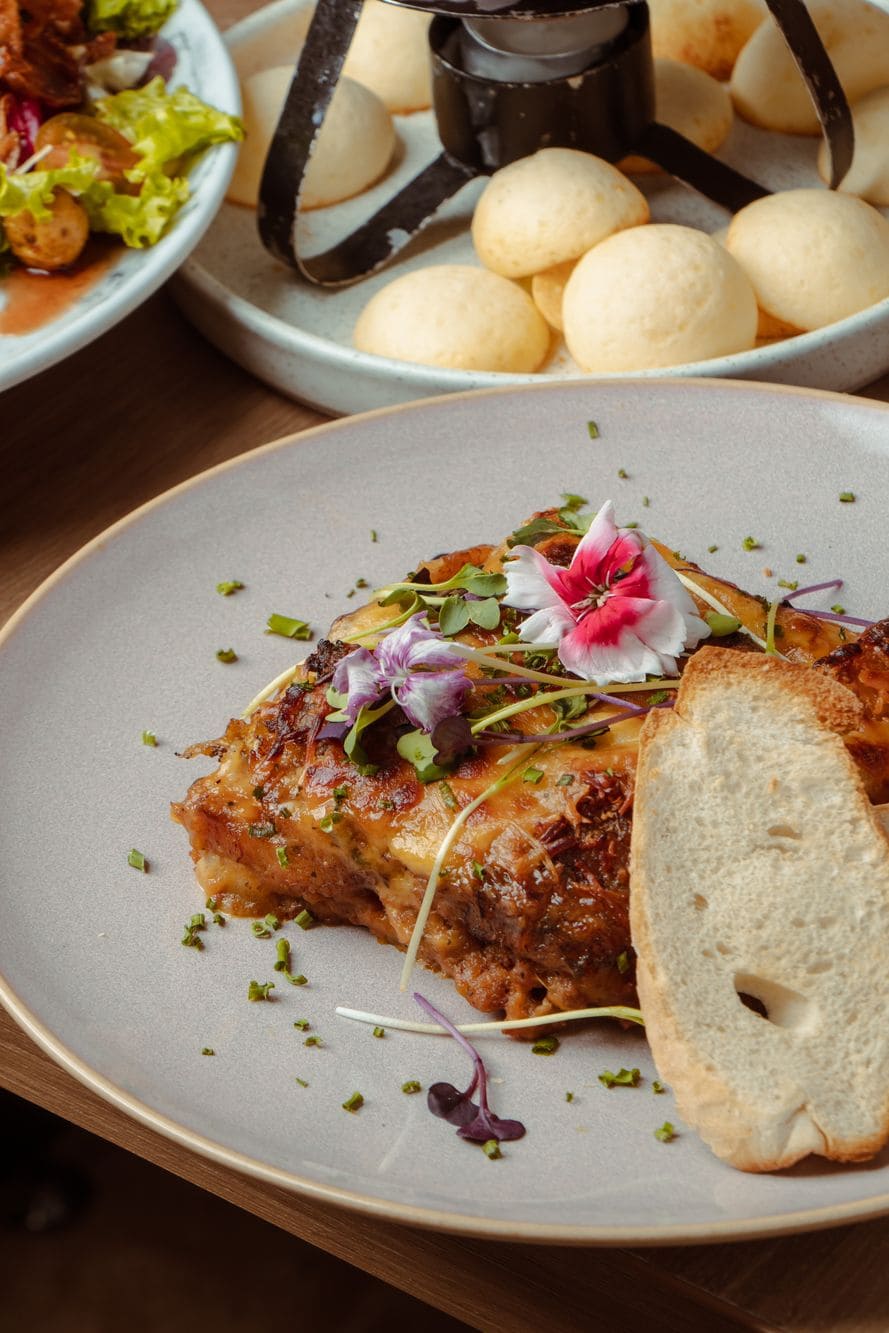 - Lasaña de plátano maduro: Rellena de carne molida de res, salsa cremosa de queso, gratinada con queso siete cueros y parmesano.