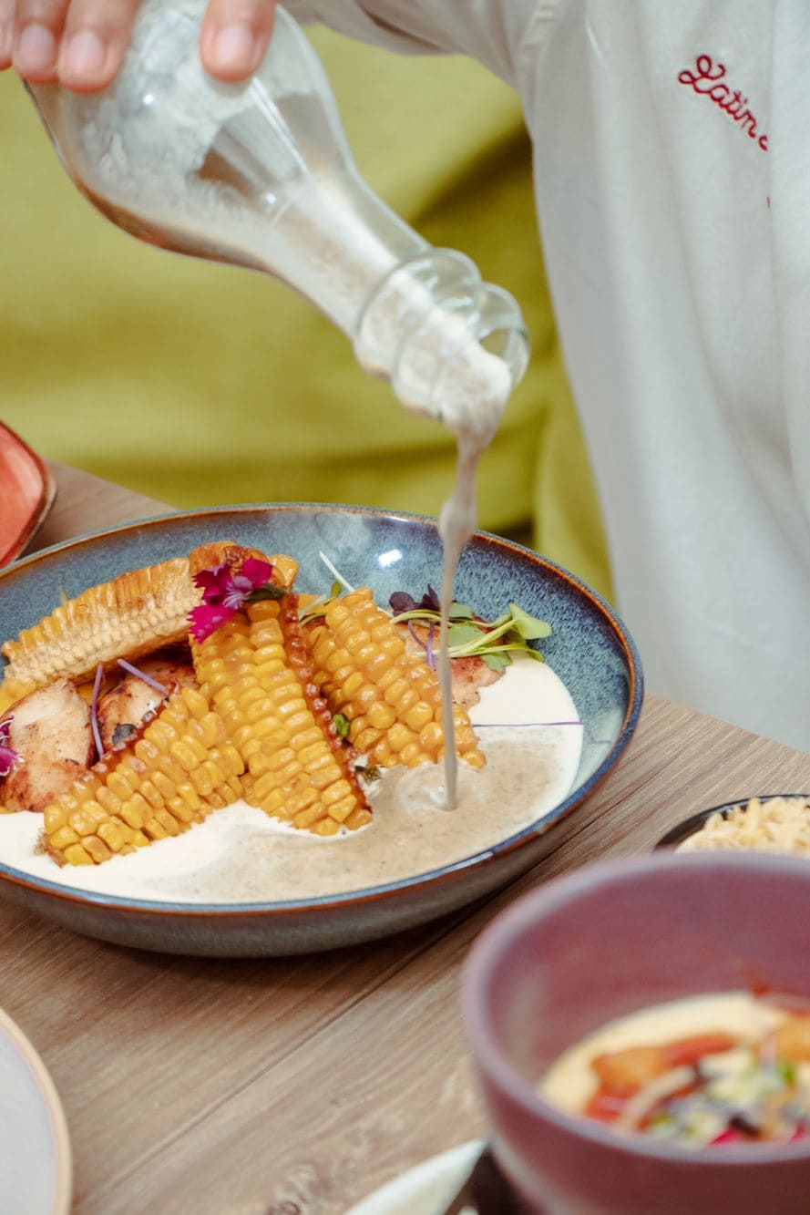 - Deconstrucción de ajiaco: Pollo a la plancha, salsa a base de pollo y guasca, tentáculos de maiz, puré de batata, cremoso de aguacate, alcaparras fritas, ripio de papa y crema de leche.
