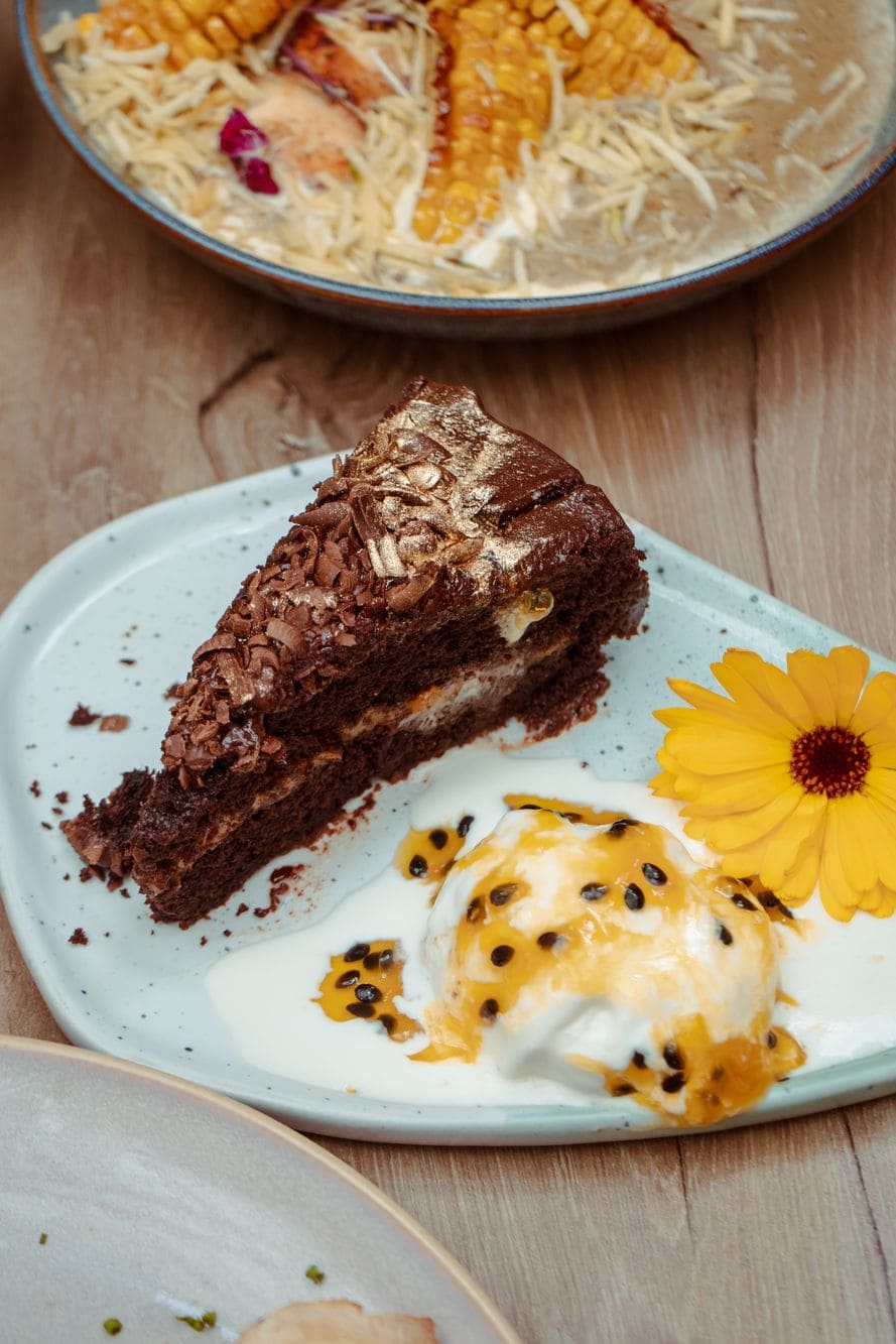 - Torta de chocolate con reducción de gulupa
