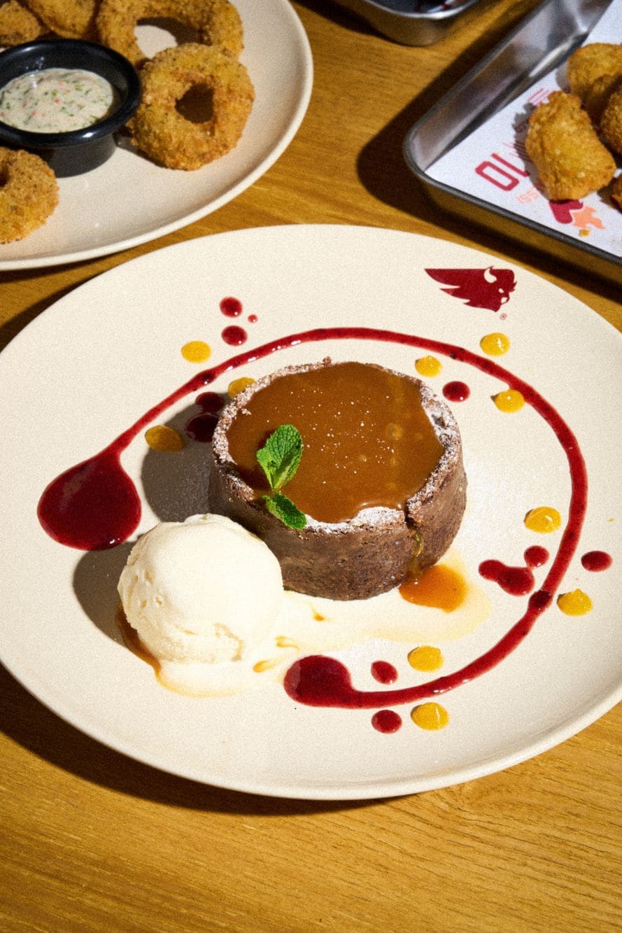 - Volcan hot wings de chocolate: El volcan hot wings de chocolate, es brownie melcochudo relleno de chocolate oscuro y salsa de caramelo salado, acompañado de helado de vainilla.