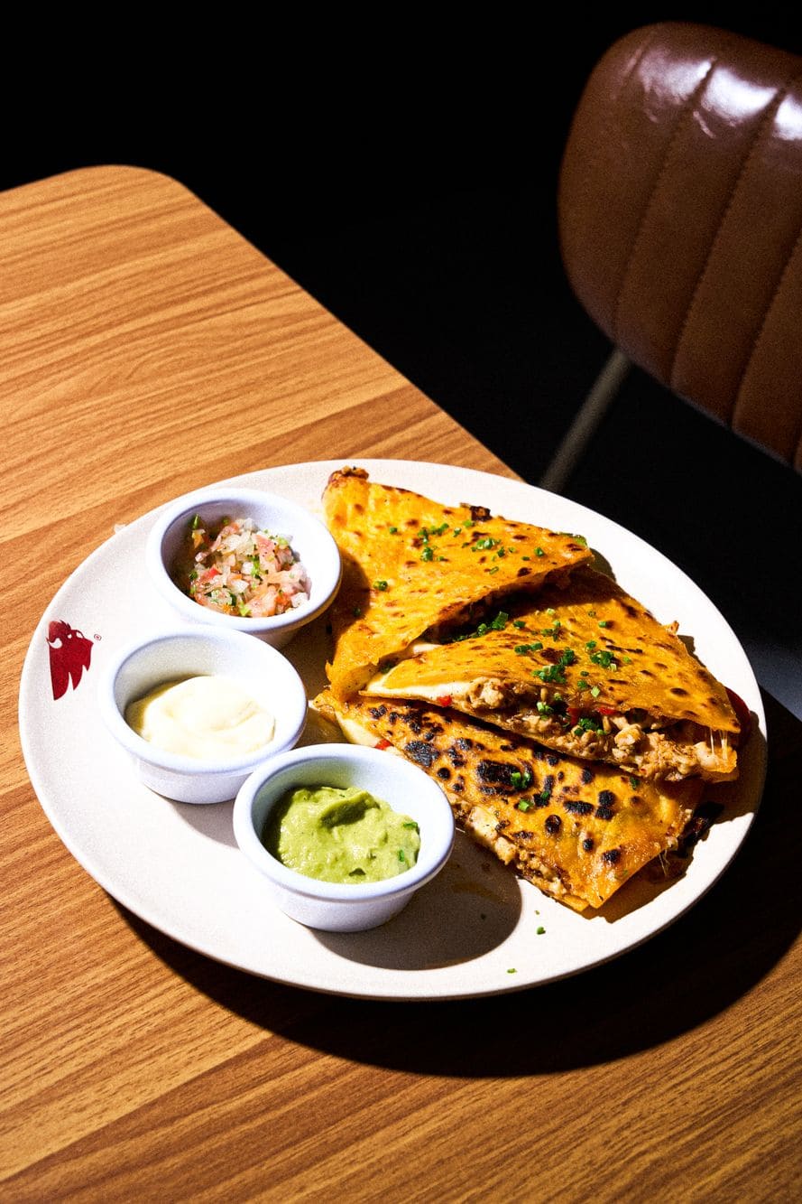 - Quesadilla hot wings: Nuestra quesadilla hot wings, es pollo salteado con pimentones y cebollas, queso fundido, acompañado de pico de gallo y guacamole.