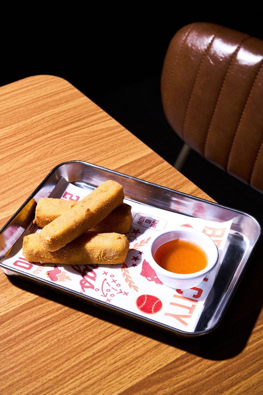 - Dedos de mozzarella x 3: 3 dedos de wueso mozzarella (Bastones) apanados, acompañados de salsa de chili dulce y frutos rojos.