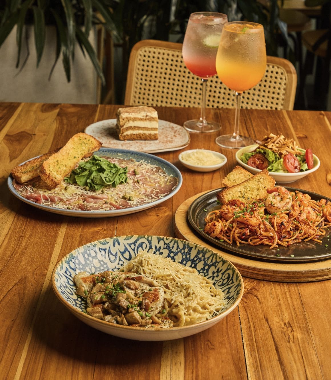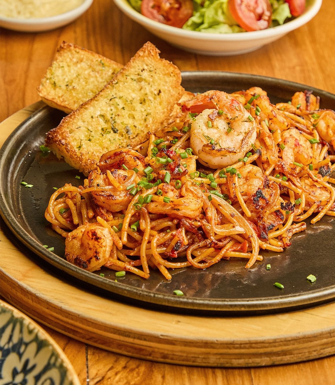 - Pastas fideuá del mar: Jugoso langostino y camarones salteados con pimentones asados sobre spaghetti en salsa pomodoro artesanal. Finalizado con un toque fresco de cebollín y acompañado de crujientes tostadas de pan con mantequilla de ajo.