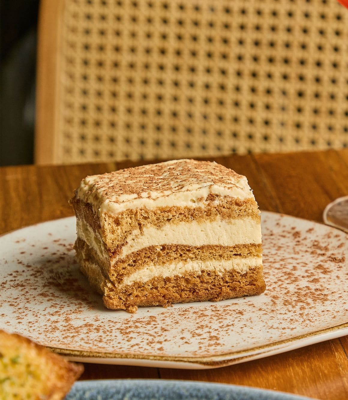 - Tiramisú: Postre italiano con capas de bizcocho al café, crema de queso y licor, espolvoreado con cocoa