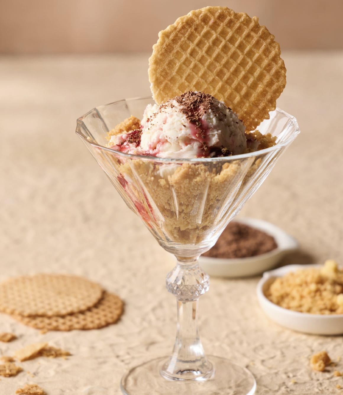 - Copas de gelato italiano amarena: Gelato con amarenas, crumble de galleta y ralladura de chocolate.