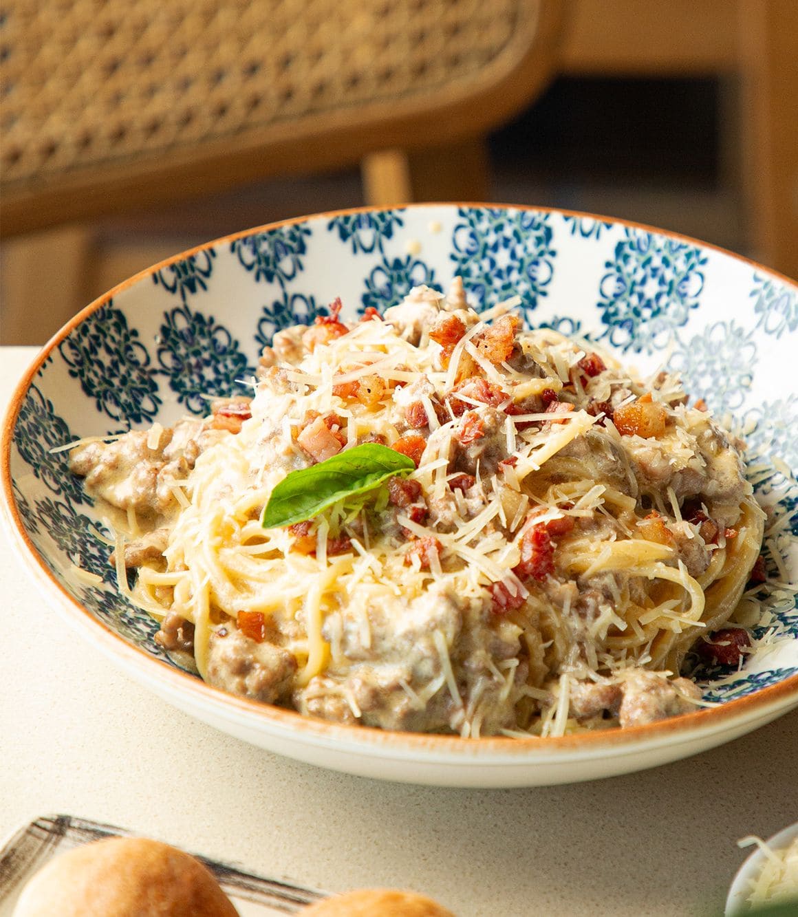 - Pasta salsiccia Italiana carbonara: Salsiccia de cerdo aromatizada con hinojo, acompañada de salsa carbonara y tocineta. Finalizada con vino tinto y queso parmesano con pancitos il forno.
