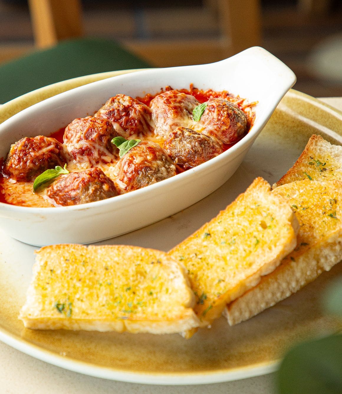 - Polpette napolitana: Ocho albondigas en salsa napolitana, gratinadas con queso parmesano. Acompañadas de tostadas de pan con matequilla de ajo.