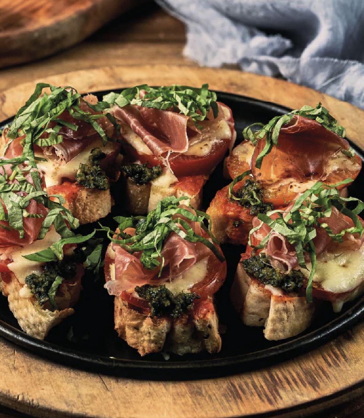 - Bruschettas Romanas: Seis tostadas de pan rústico al horno, gratinadas en salsa napolitana y pesto, con jamón serrano, queso mozzarella, rodajas de tomate y albahaca.