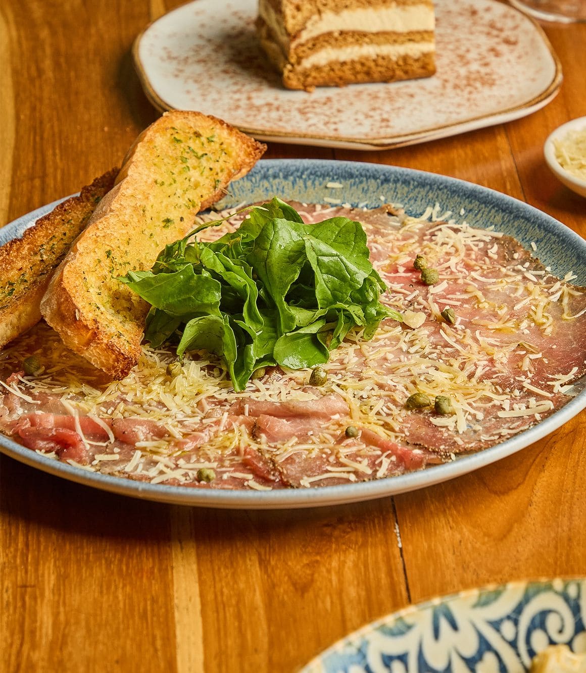 - Carpaccio de res: Láminas de res marinadas y acompañadas de alcaparras, rugula y queso parmesano. Tostadas de pan con mantequilla de ajo.