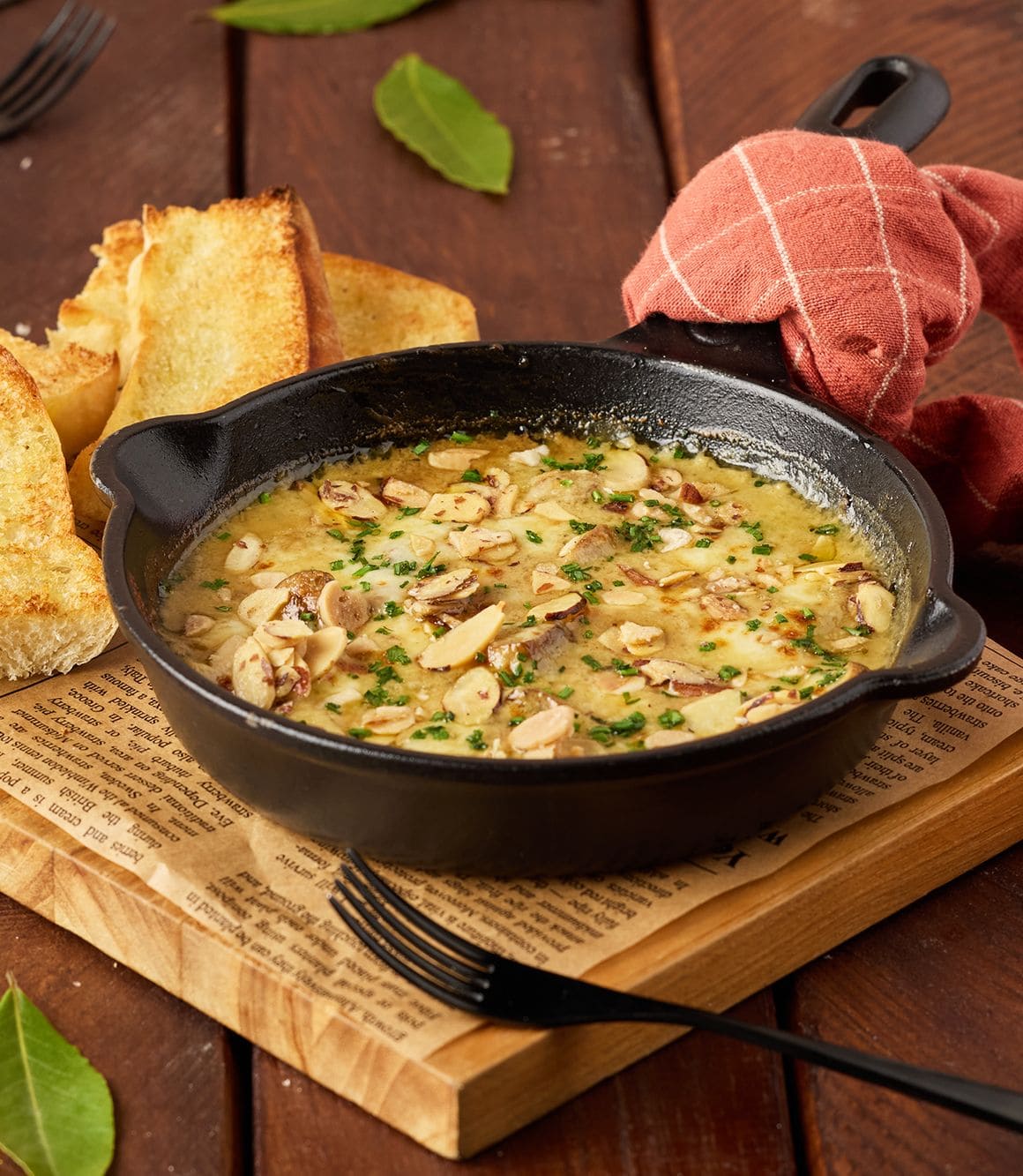 - Fundido de queso y trufa: Champiñones salteados, trufa, queso azul, mozzarella y almendras. Acompañada de pan ciabatta.