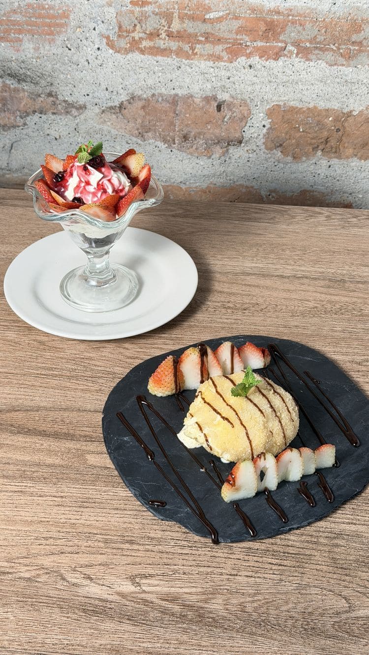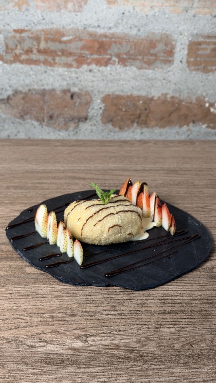 - Tempura fuji: Irresistible helado en tempura, con una cobertura dorada y crujiente que resguarda su cremoso interior. Bañado con salsa de chocolate y arequipe, y realzado con un sutil toque de fresas y kiwi que aportan frescura y contraste.