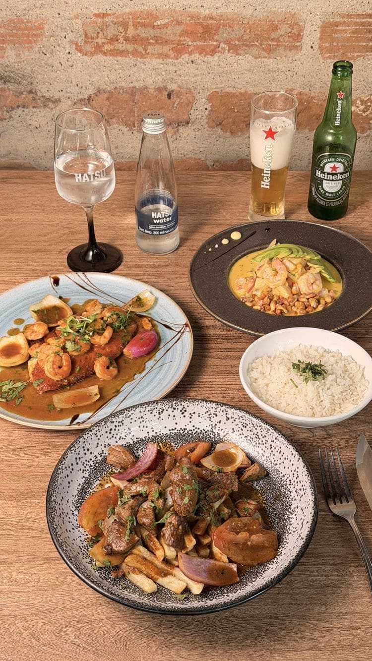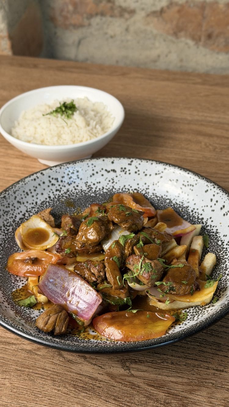 - Lomo saltado: Tiernos cortes de lomo de res, salteados al estilo tradicional con cebolla, ají amarillo y jugosos tomates, en una preparación llena de aroma y carácter. Acompañado de arroz blanco y papas a la francesa, creando un equilibrio perfecto entre tradición y sofisticación