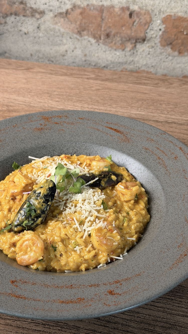 - Arroz cremoso de mariscos: Exquisita fusión de camarones, calamares, mejillones y selectos frutos del mar, delicadamente preparados en un aromático bisque de mariscos, realzado con queso parmesano y un sutil toque de pimentón, logrando una textura cremosa y un sabor profundo del océano.