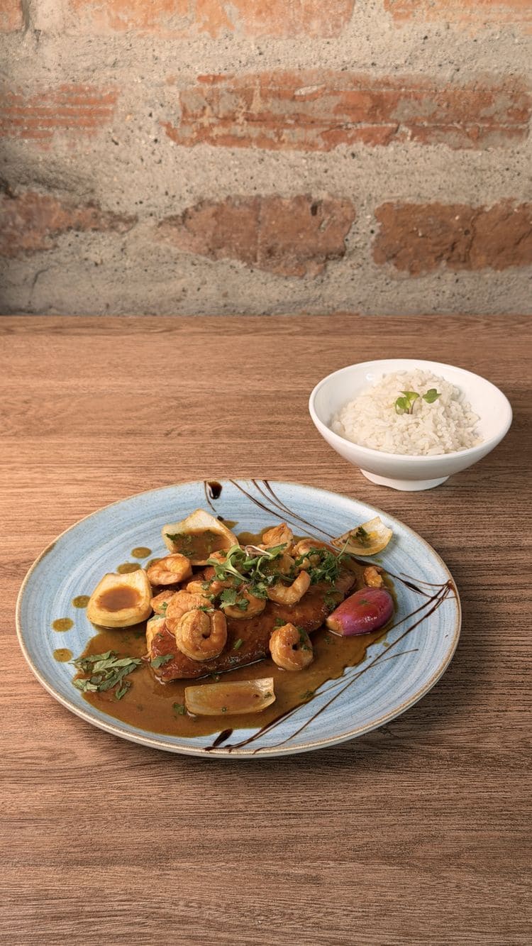 - Pescado a la chorrillana: Fino filete de pescado bañado en una delicada salsa de ají amarillo y vino blanco, acompañado de camarones, cebolla, tomate y cilantro fresco, que aportan intensidad y frescura al plato. Servido con arroz blanco para complementar esta elegante combinación de sabores.