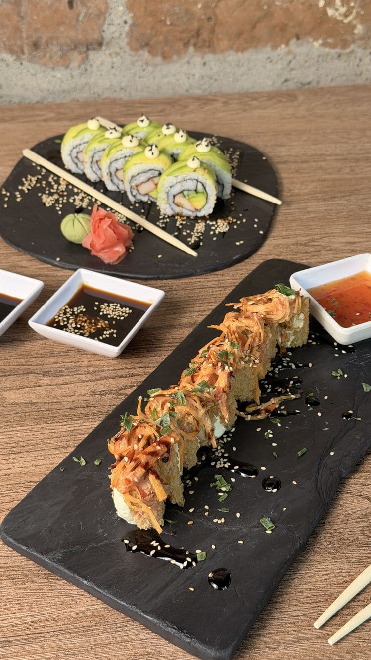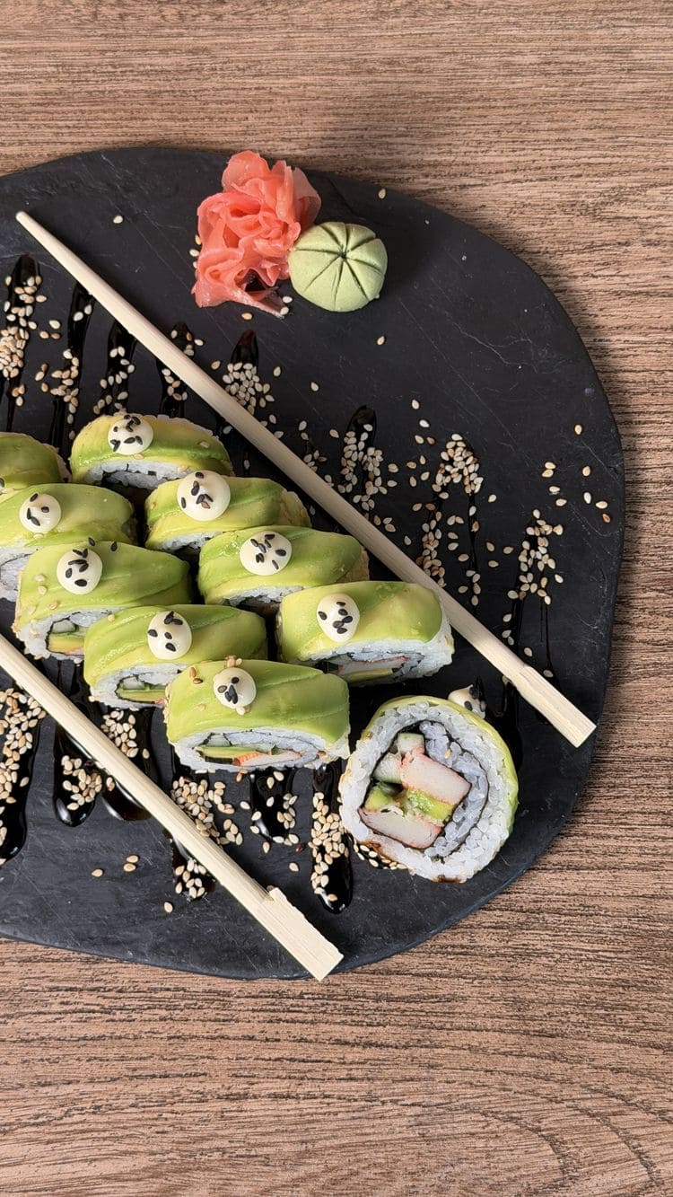 - California roll (10 bocados): Exquisito rollo de sushi con fina cobertura de aguacate, relleno de kanikama, aguacate cremoso y pepino fresco, logrando una armonía perfecta entre suavidad, frescura y delicadeza en cada bocado.