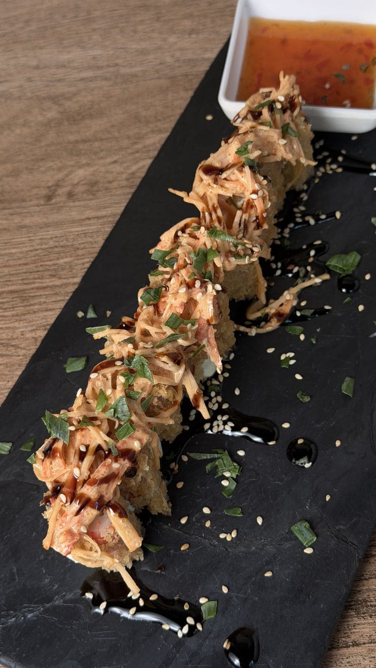 - Kanikama tempura: Delicados palmitos de cangrejo en tempura, dorados hasta alcanzar una textura ligera y crujiente, acompañados de suave queso crema y una sutil salsa chili dulce, ofreciendo un contraste entre lo crocante, lo cremoso y lo dulce