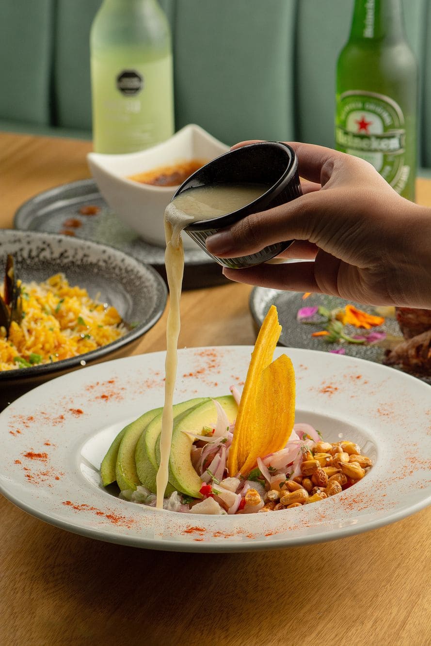 - Ceviche Peruano: Dados de pescado fresco marinados en limón, ají rocoto, cilantro y cebolla morada. Acompañado de chips de plátano y aguacate, es un plato vibrante, refrescante y con la intensidad perfecta para transportarte directo a la costa peruana.