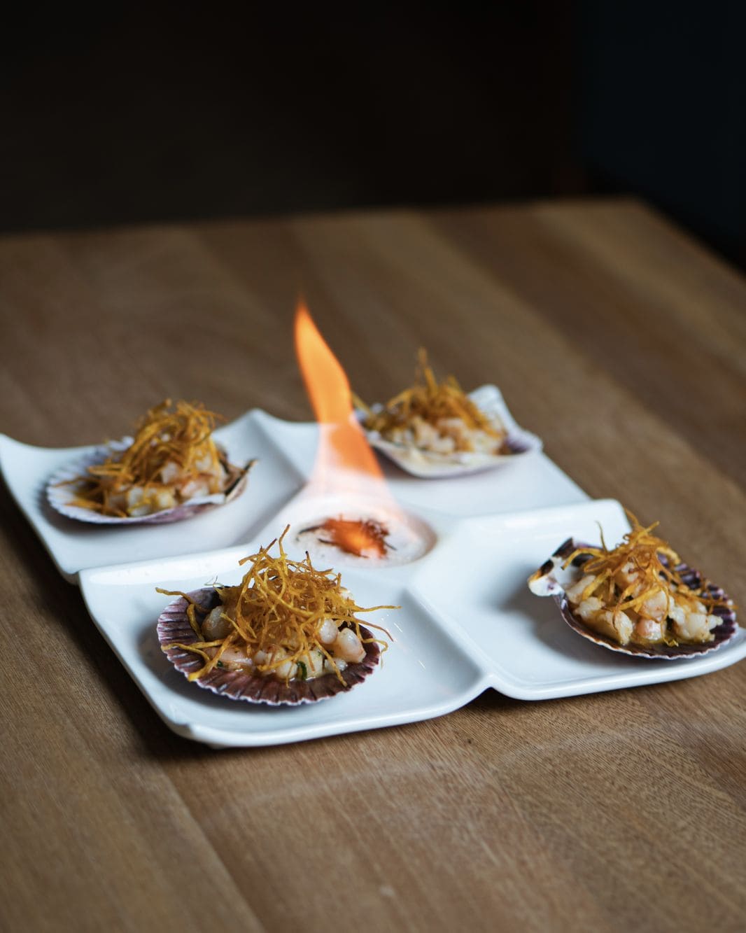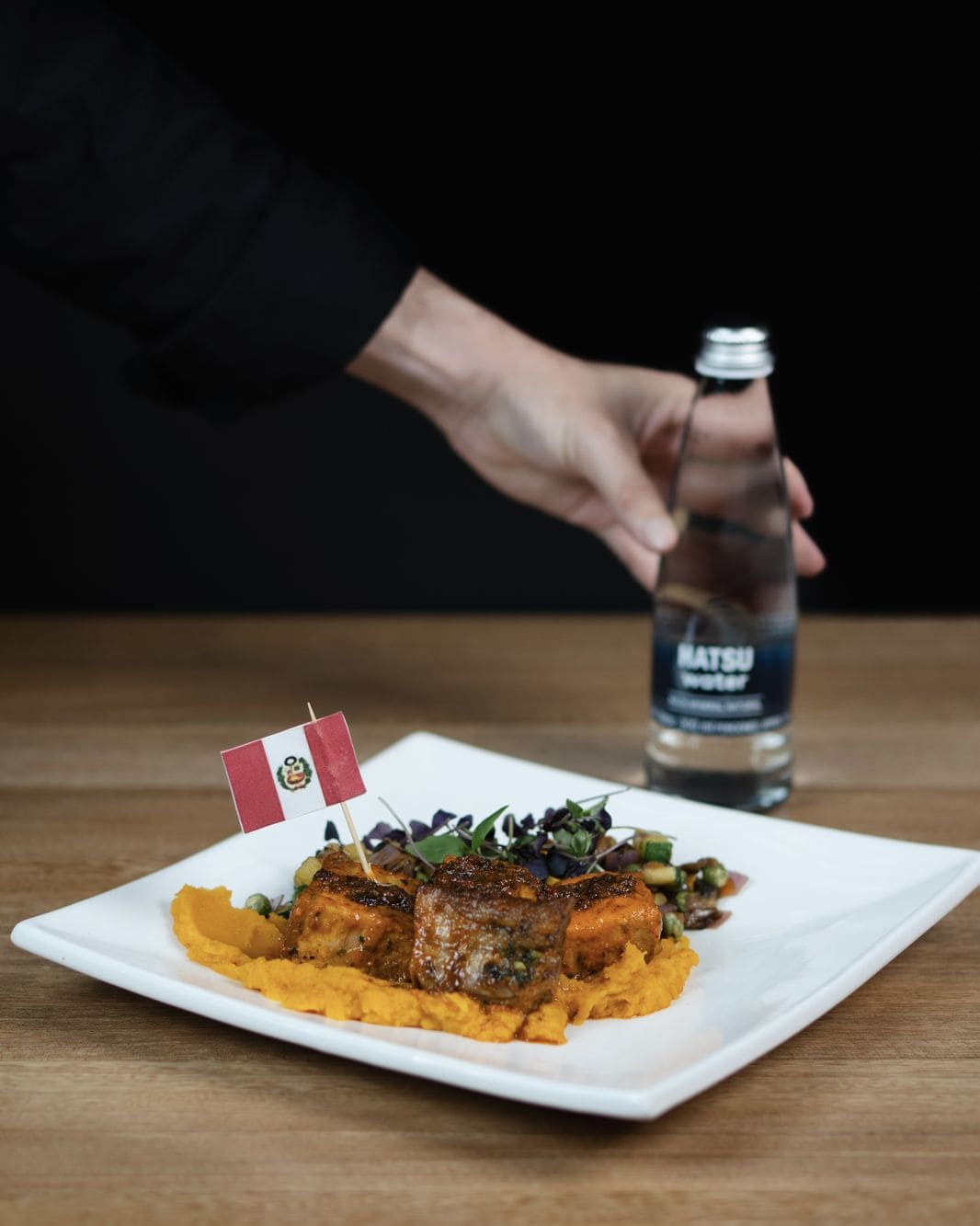 - Pork belly: Panceta marinada y cocinada lentamente por varias horas, servida con un cremoso pure de camote y vegetales tatemados.