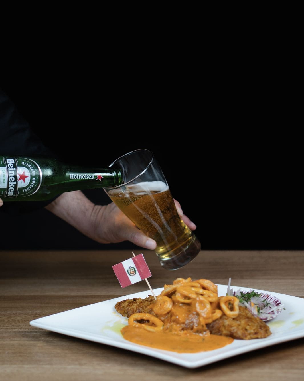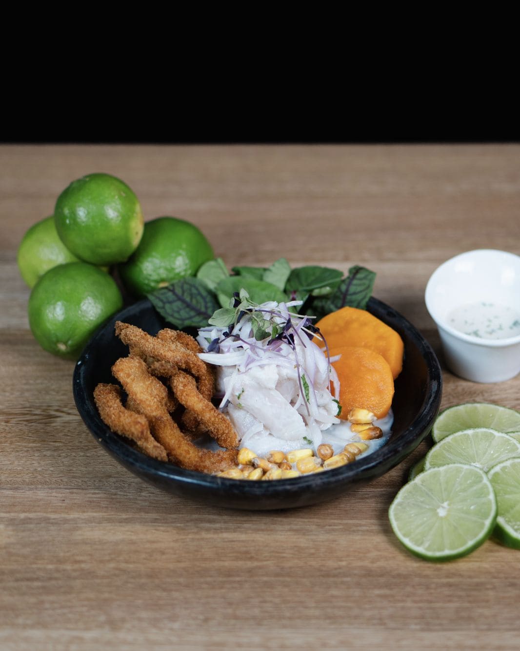 - Ceviche carretillero: Pescado fresco marinado en leche de tigre, cebolla, cilantro, yuca frita ,cancha y crocante de pota
