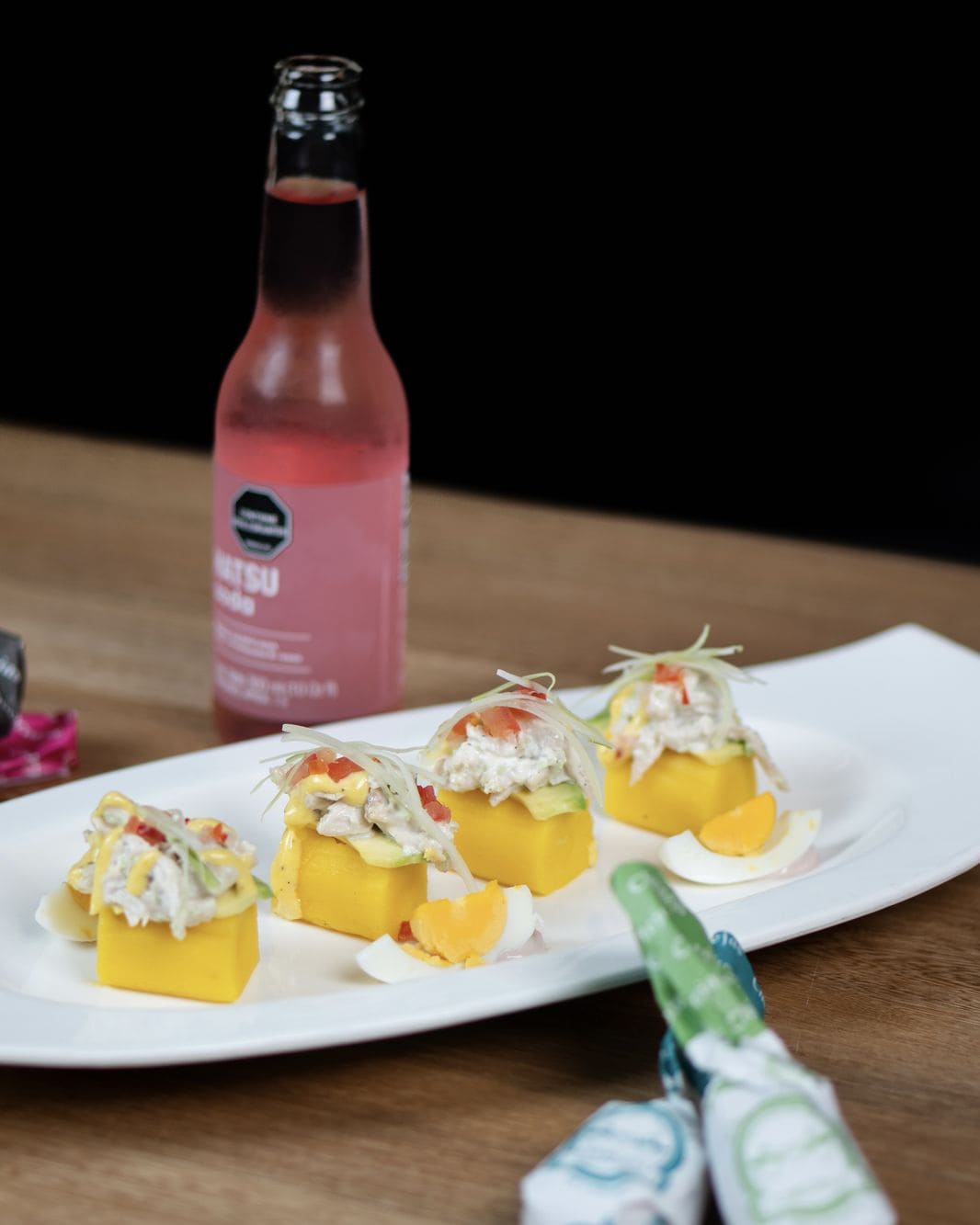 - Causa limena de pollo: Pure suave de papa, relleno con pollo en salsa tartara, aguacate, tomate y huevo cocido
