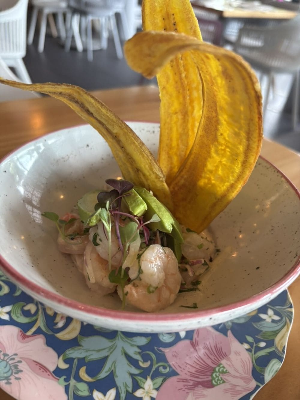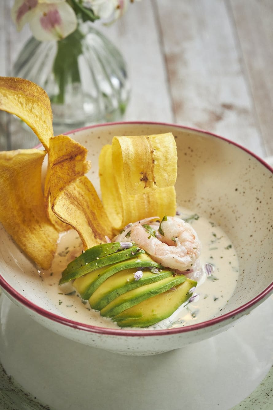 - Ceviche peruano: Nuestra versión inca, una mezcla de camarón, palmitos y cebolla, marinados en una leche de tigre. Acompañado de unas cintas de plátano.