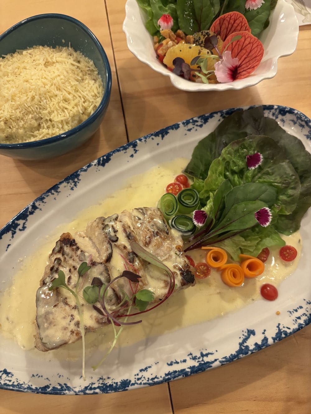 - Pesca fresca del pacifico colombiano: Bañada de una salsa cremosa de mantequilla al limón y un crocante de coco dulce acompañada de pure de papa cremoso.