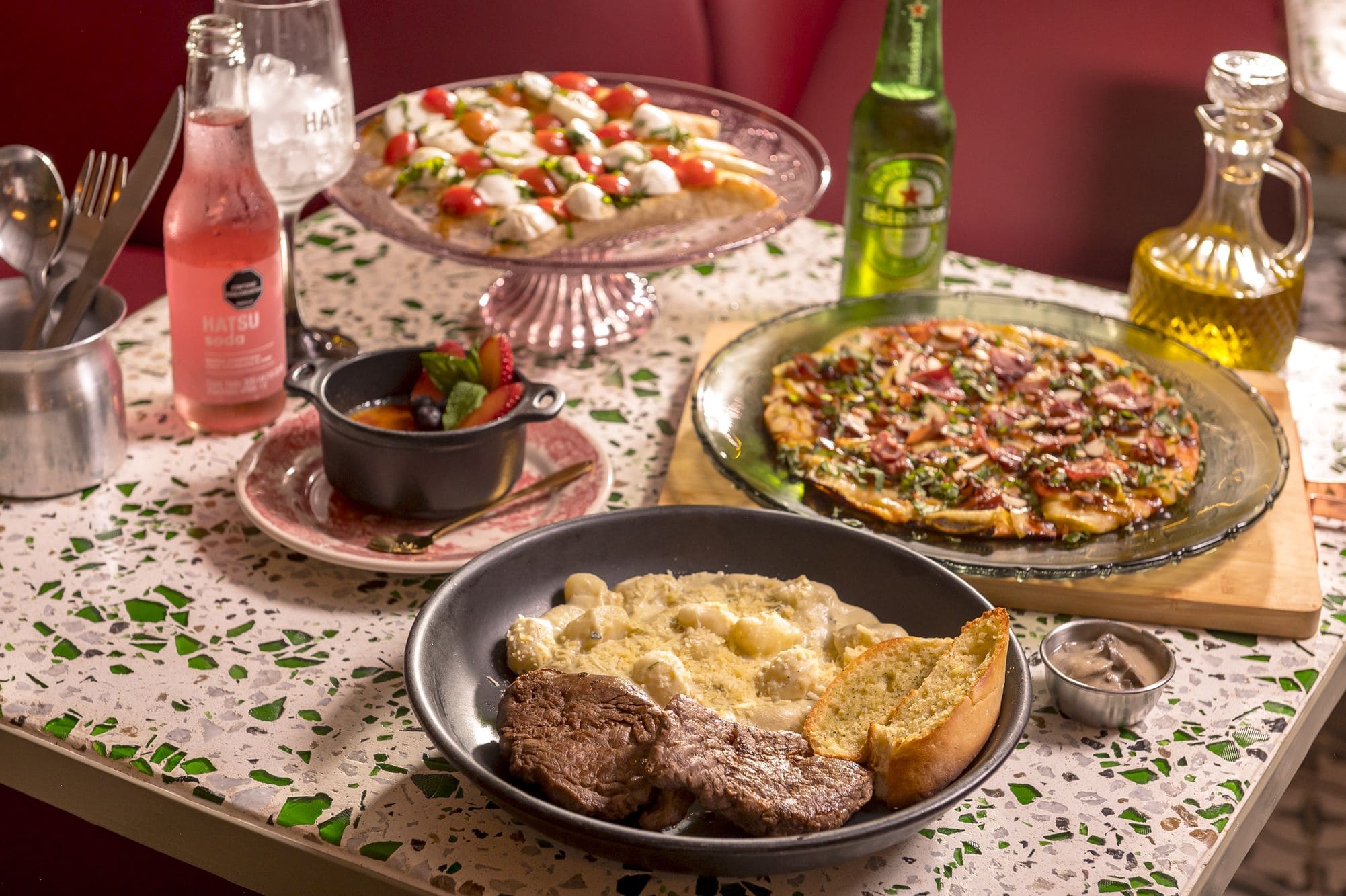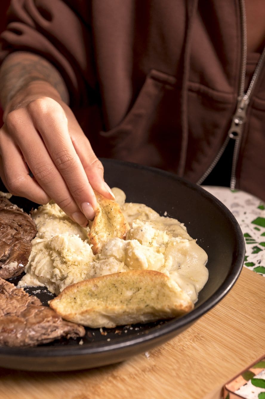 - Gnoquis de julieta: Medallones de solomito acompañados con pasta de papa italiana en salsa cuatro quesos, parmesano y pan francés de la casa