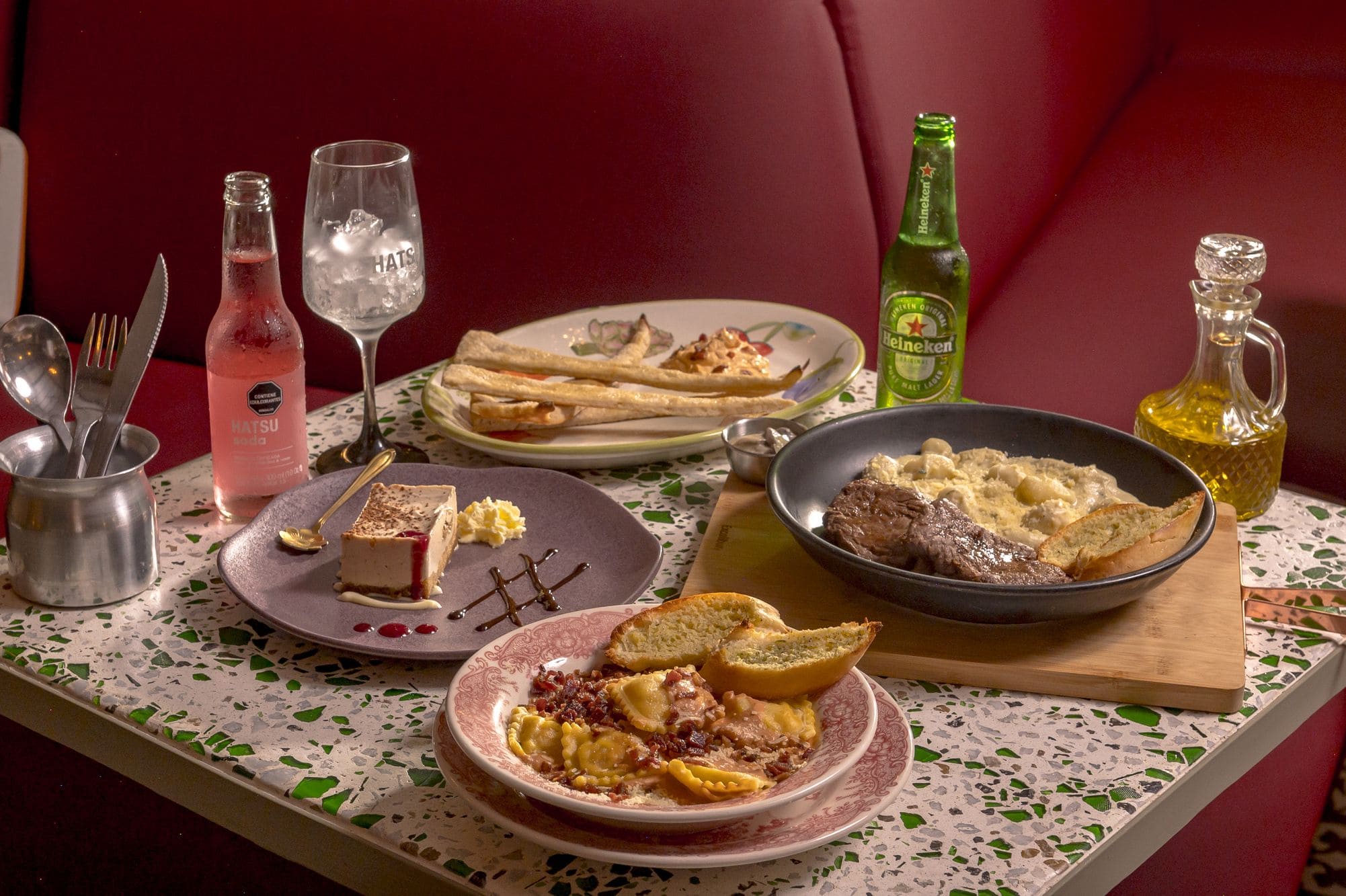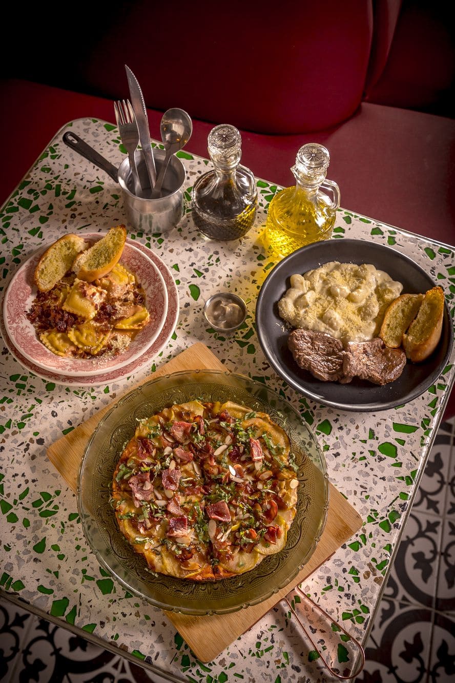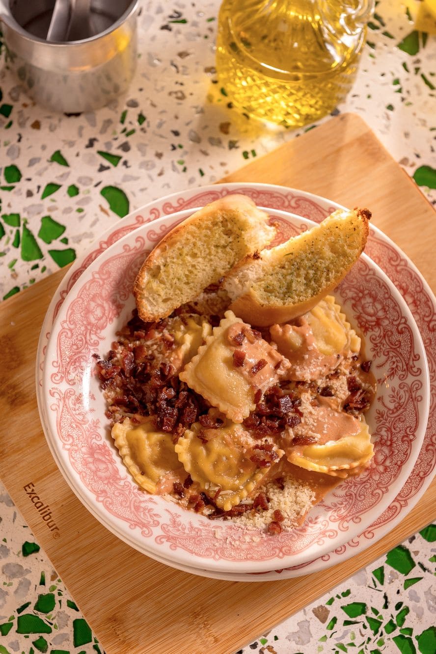 - Raviolis rose: Raviolis artesanales rellenos de tocineta, bañados en salsa rose de la casa, finalizado con topping de tocineta crocante y pan francés.