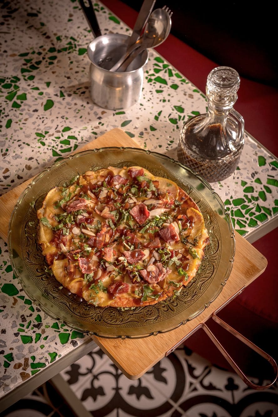 - Trilogía de van gogh: Combinación de tocineta, nueces, manzana verde caramelizada, queso azul, balsámico y albahaca