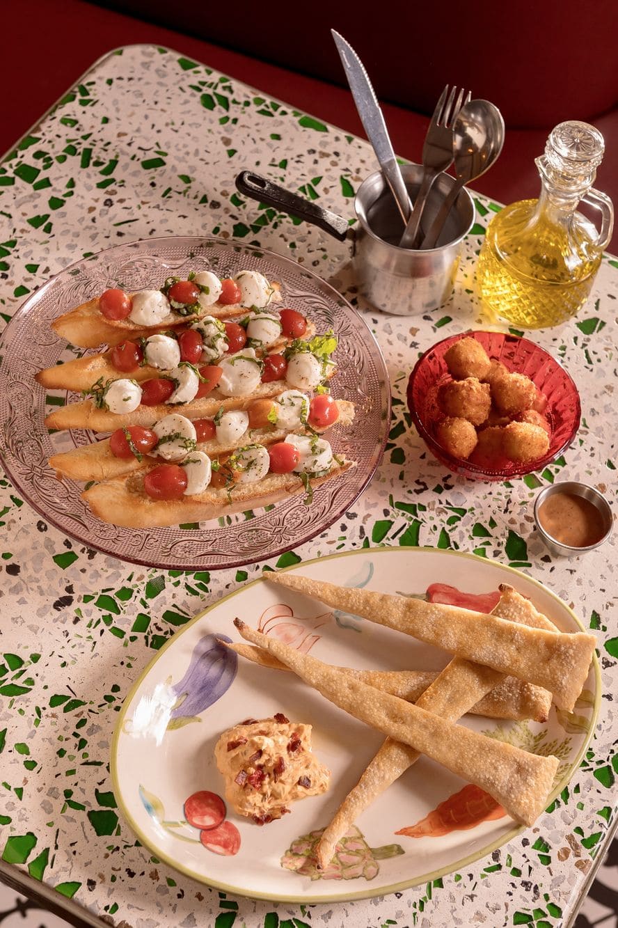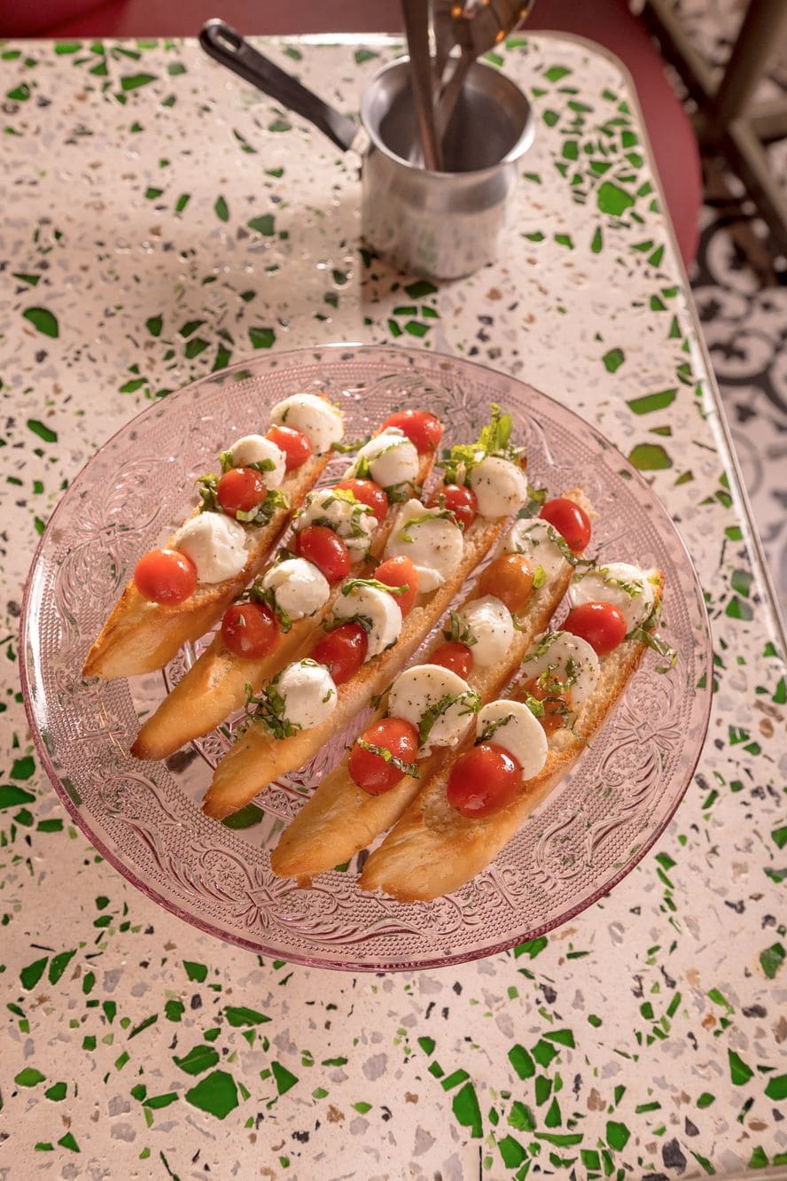 - Bruschettas: Tostadas de pan artesanal con tomatillo y queso ciligine de búfala, especiado con albahaca, pimienta y aceite de oliva
