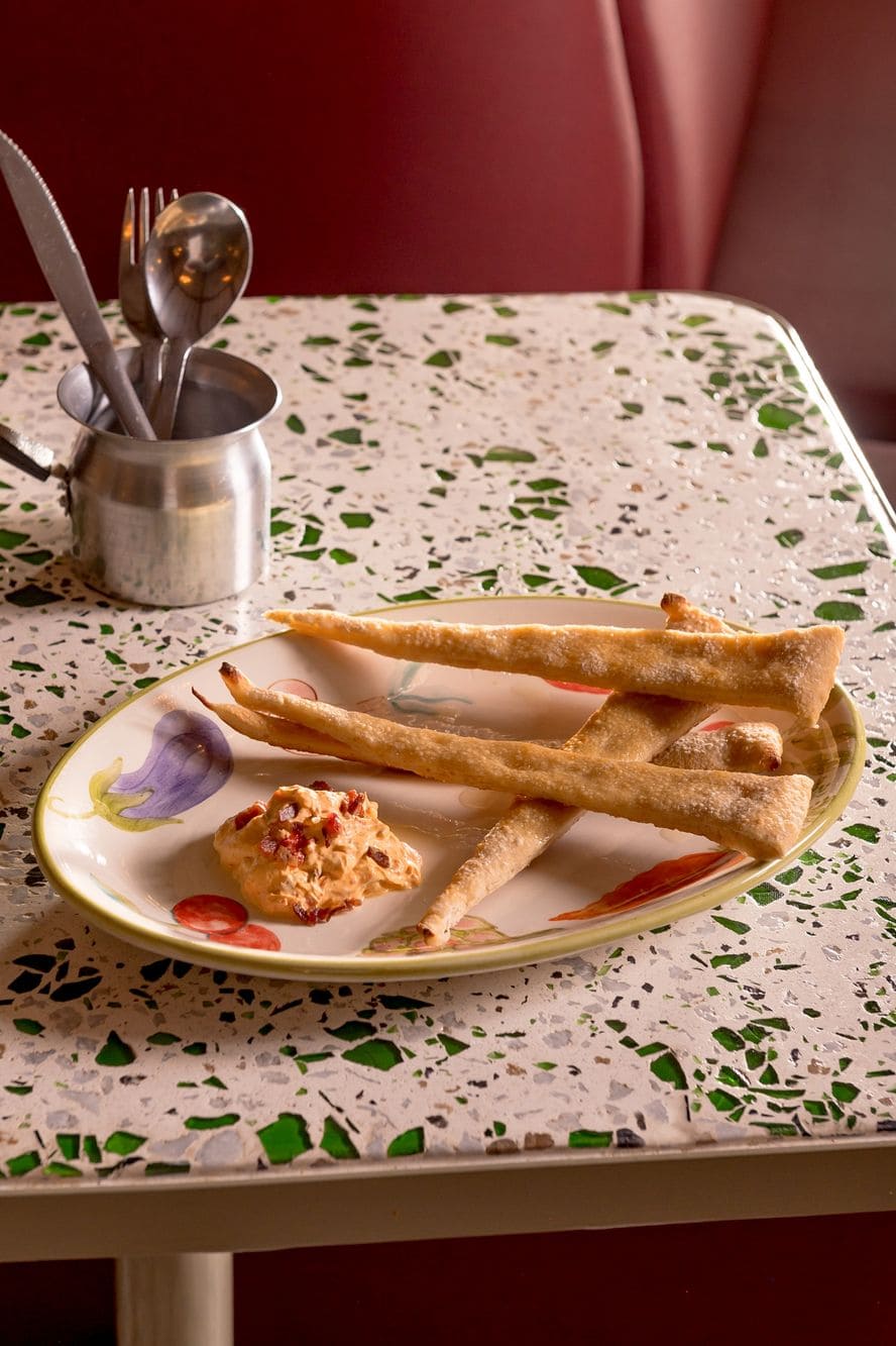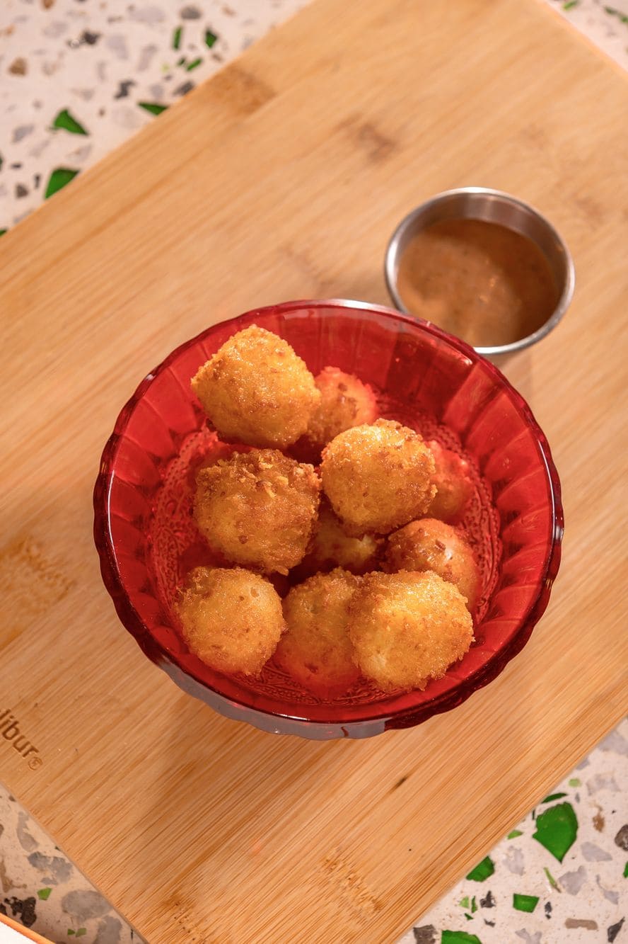 - Bastones crocantes: Crocantes de masa acompañados de queso crema de pimentón, tocineta y miel