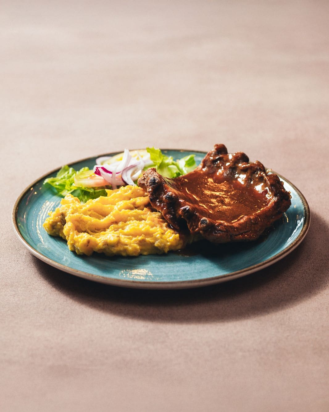 - Costillas bbq: Costillar estilo st. louis bañado en salsa de tamarindo. Acompañado de puré cremoso de papa criolla o papas a la francesa, con ensalada de lechuga y crotones
