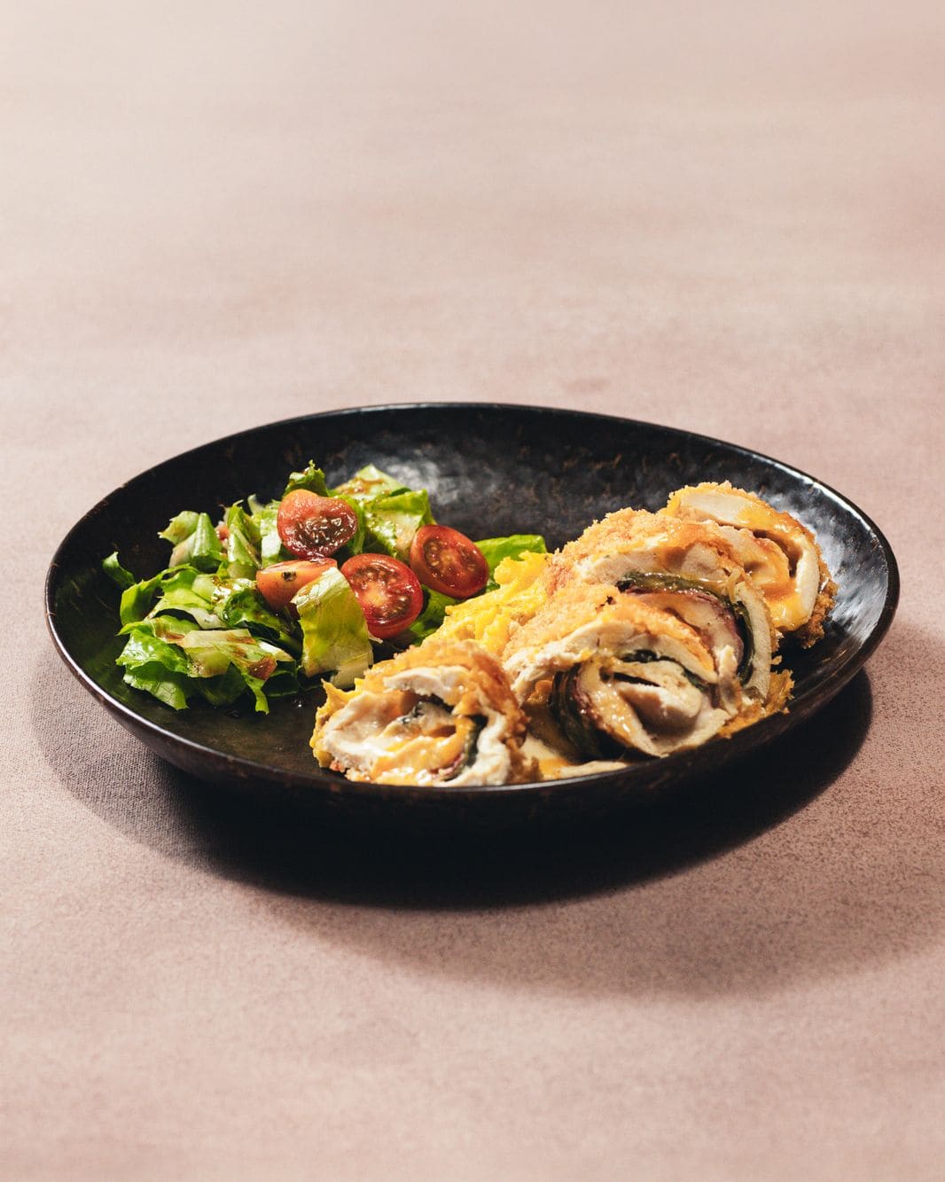 - Pollo a la valenciana: Rollo apanado de pechuga de pollo, jamón serrano y queso mozarella. Bañado en salsa agridulce de naranja y acompañado de puré cremoso de papa criolla y ensaladilla de mix de lechugas con tomate cherry