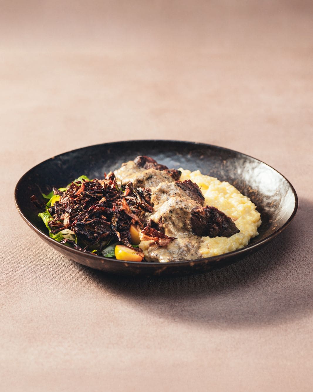 - Risotto de queso con solomito en salsa de setas: Cremoso, profundo y reconfortante. Risotto de queso coronado con solomito tierno en salsa de setas y champiñones deshidratados.