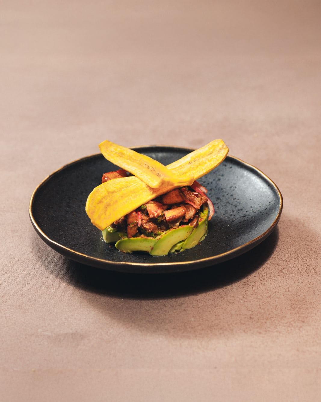 - Ceviche de chicharrón spicy: Versión picante de nuestro ceviche, mezclado con mayo picante, sour cream y un toque cítrico. Montado sobre un aro de aguacate, coronado con chips de plátano y bañado con una vinagreta de maracuyá. El equilibrio perfecto entre acidez y picor.