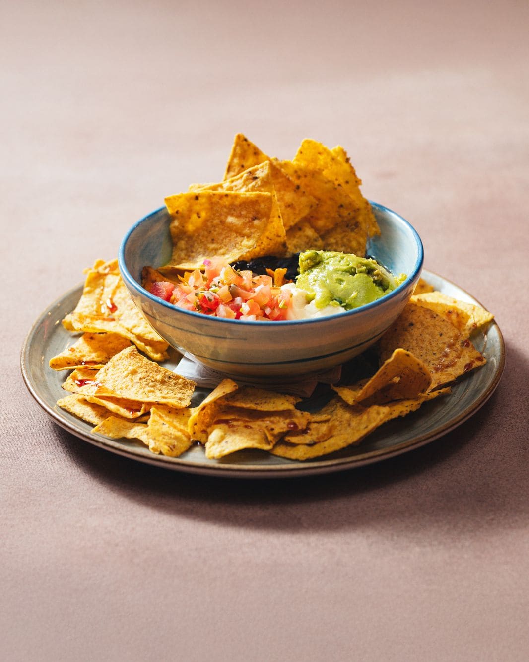 - Cochinita pibil: Guacamole, sour cream, pico de gallo y totopos acompañados de queso fundido