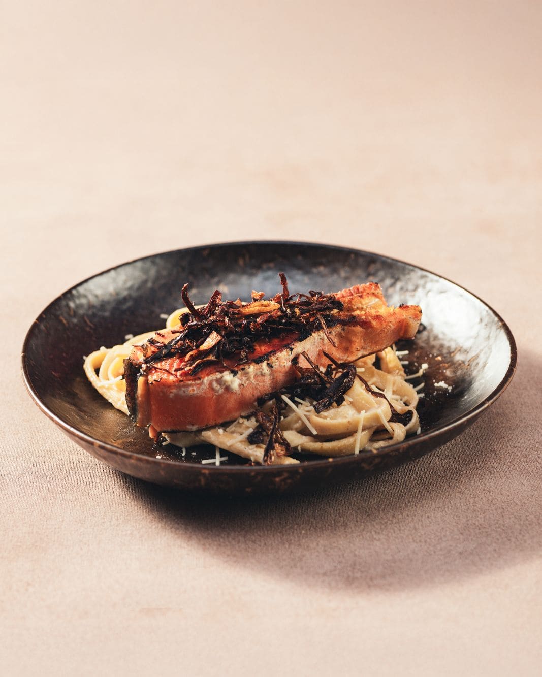 - Fetuccine con salmón independiente: Pasta bañada en una salsa cremosa inspirada en la nogada mexicana (nueces y almendras) con un toque de vino dulce. Coronada con un filete de salmón asado a la perfección y bañado en crema de poblado.