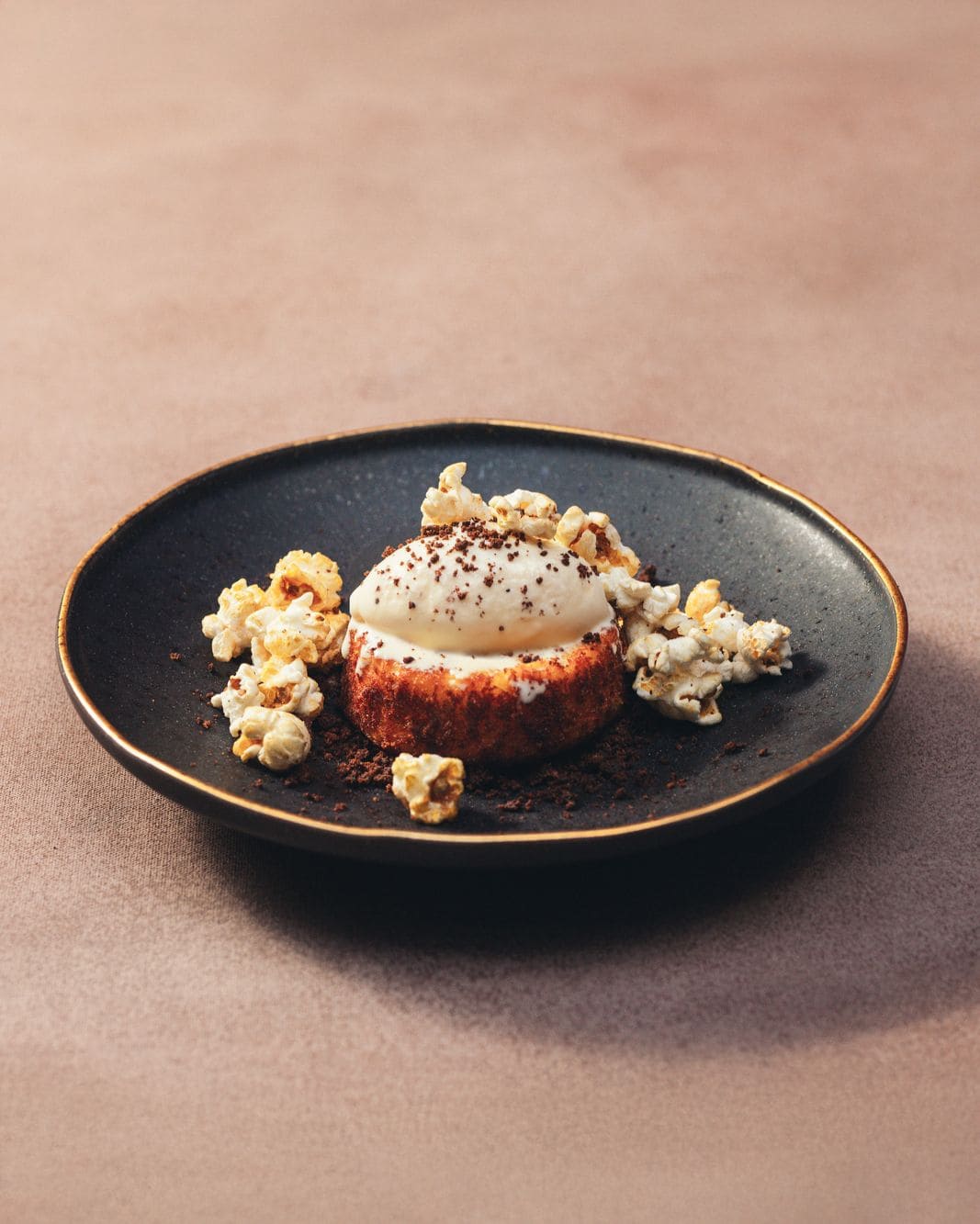 - Frutos de la tierra: Pan de elote suave, crumble de almendra con cocoa, helado de crema de tequila y crispetas. Un postre lleno de carácter y contrastes de textura, la mejor forma de cerrar la cena.
