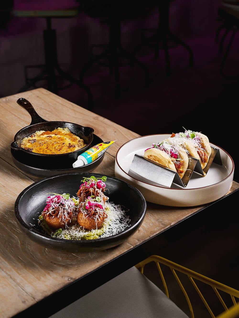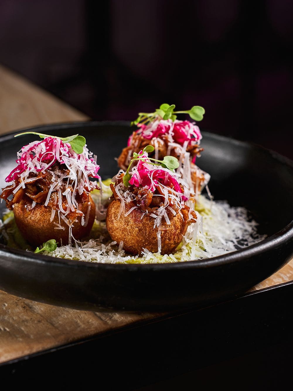 - Buñuelos de pulled pork: Buñuelos dorados y crujientes rellenos de pulled pork, servidos con mermelada de tocineta, chucrut y guacamole de la casa que equilibran sabores dulces, ácidos y cremosos.