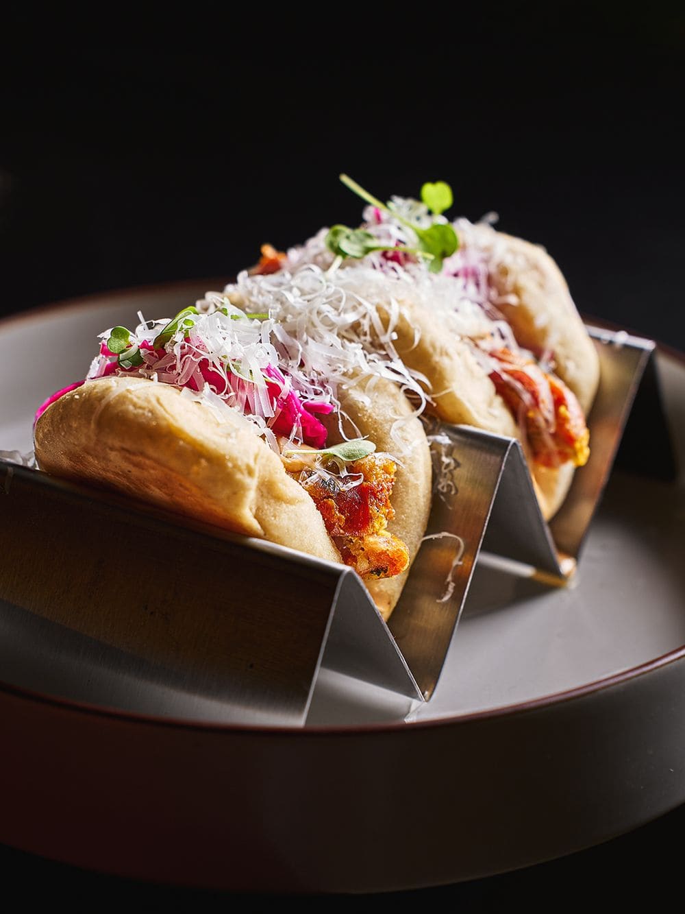 - Bao de chorizo x2: Dos suaves baos al vapor rellenos con jugoso chorizo artesanal, chucrut crujiente, cremosa salsa de pepinillos y parmesano rallado.