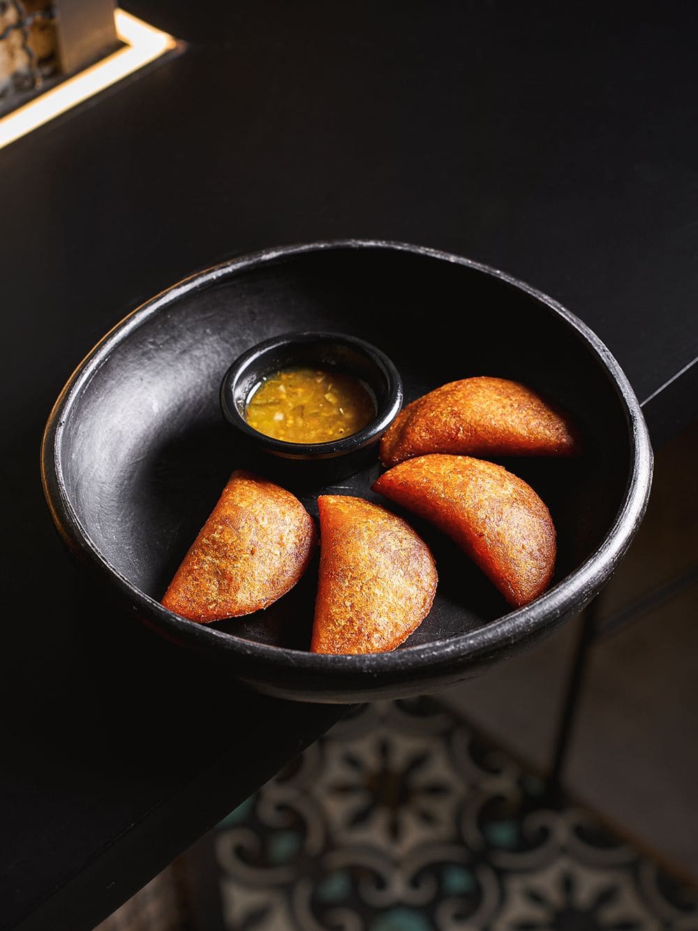 - Empanadas de posta x 4: Empanadas doradas y crujientes rellenas de jugosa posta desmechada, acompañadas de ají de lulo que resalta los sabores con su frescura y acidez.