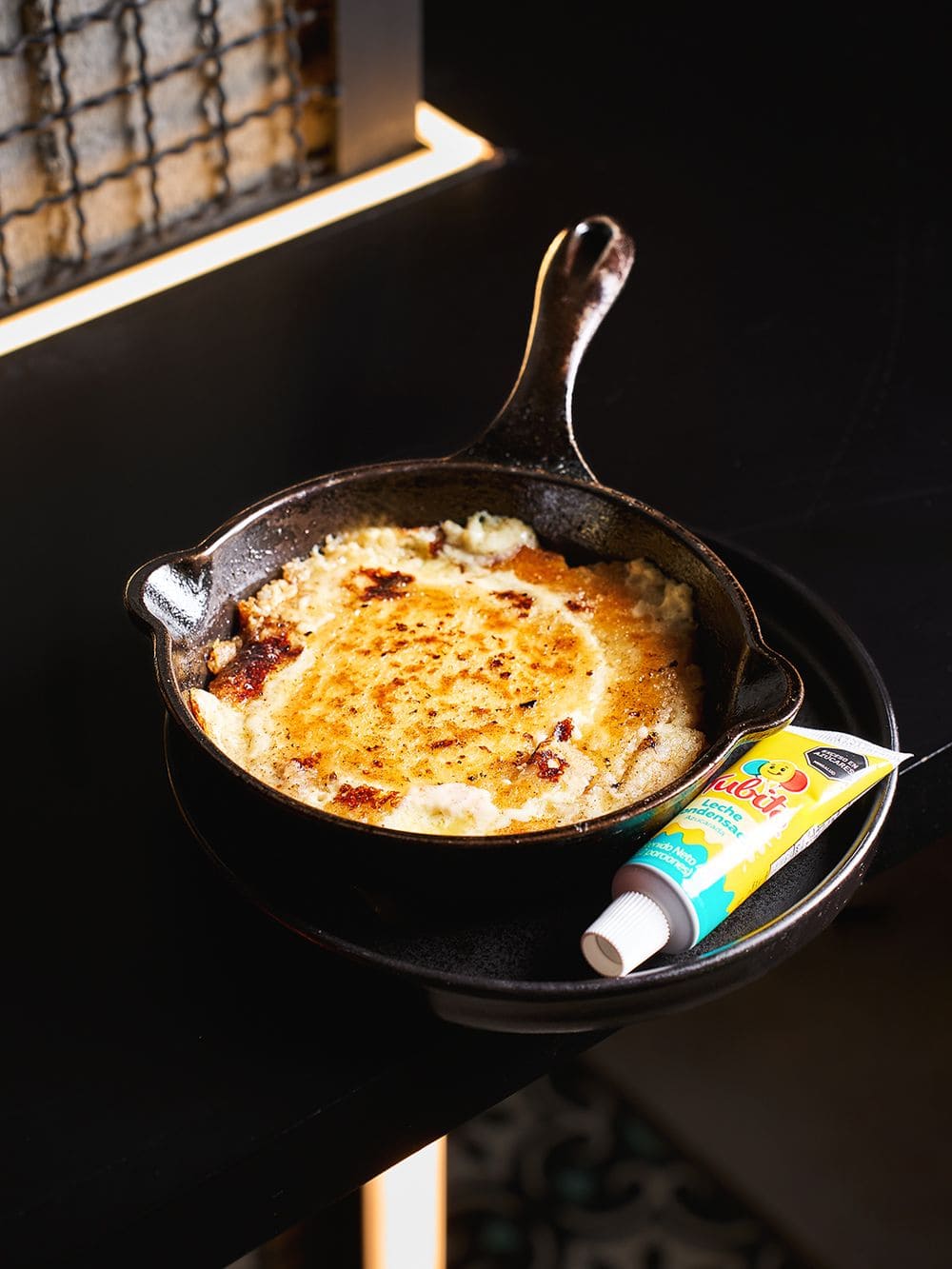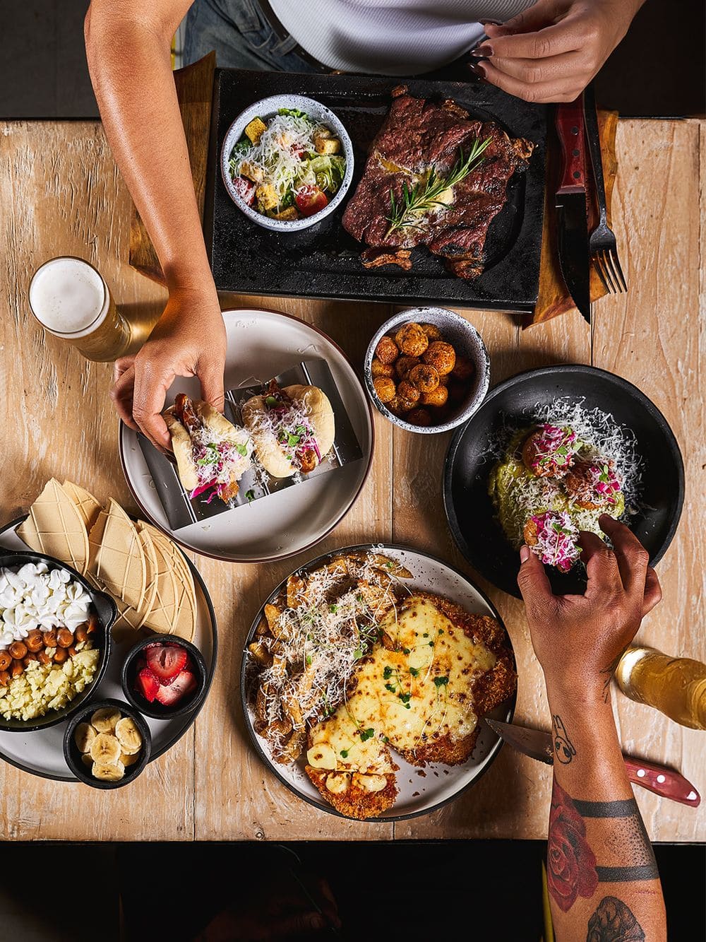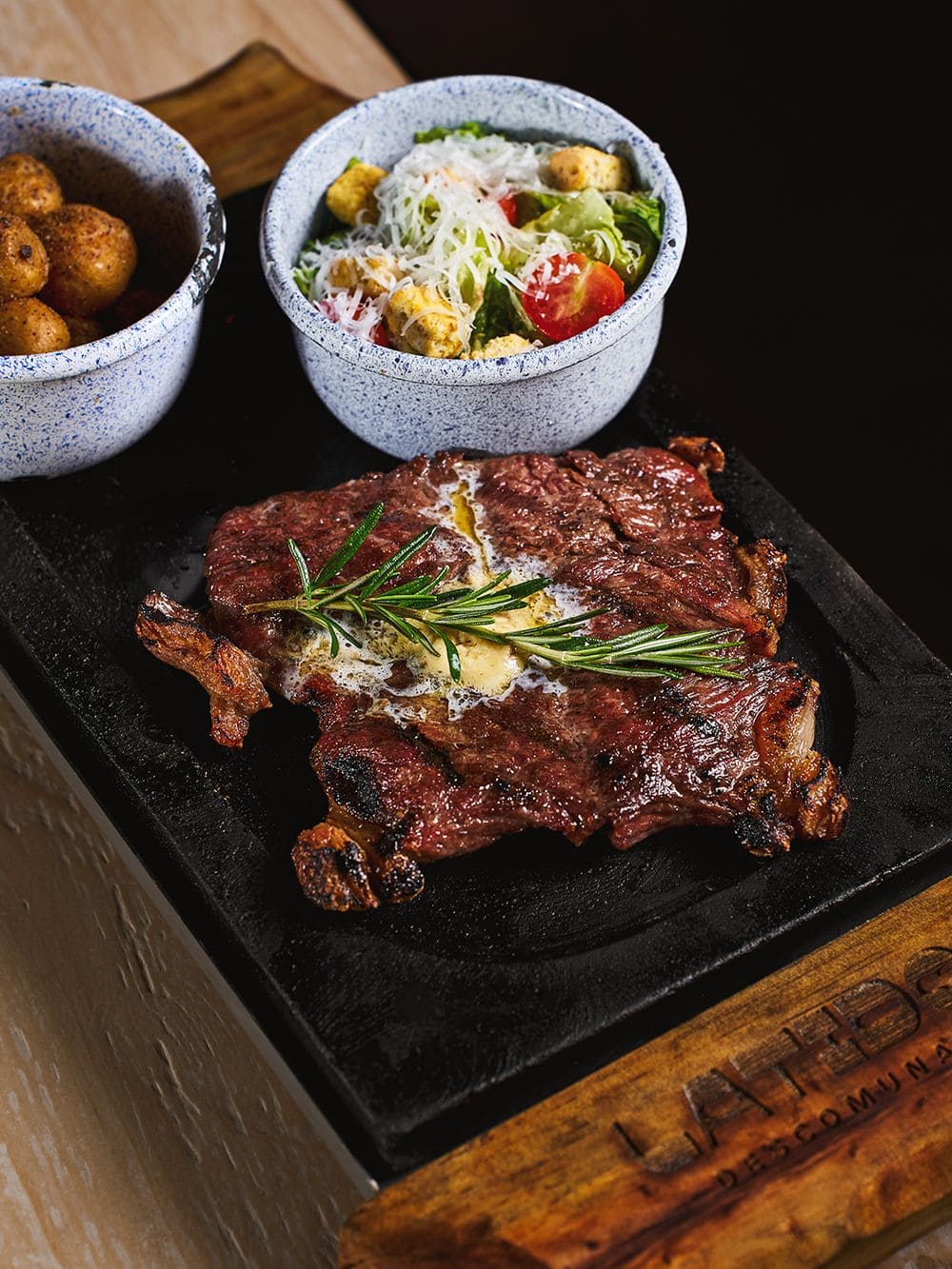 - Churrasco: Corte de res jugoso sellado a la parrilla, terminado con mantequilla aromatizada de trufa y romero, acompañado de papa criolla dorada, crujiente y salsa de la casa
