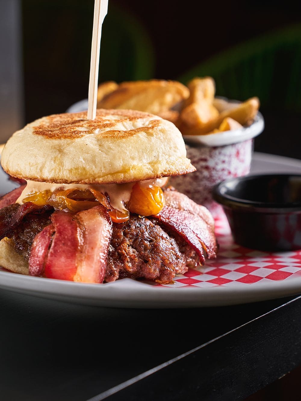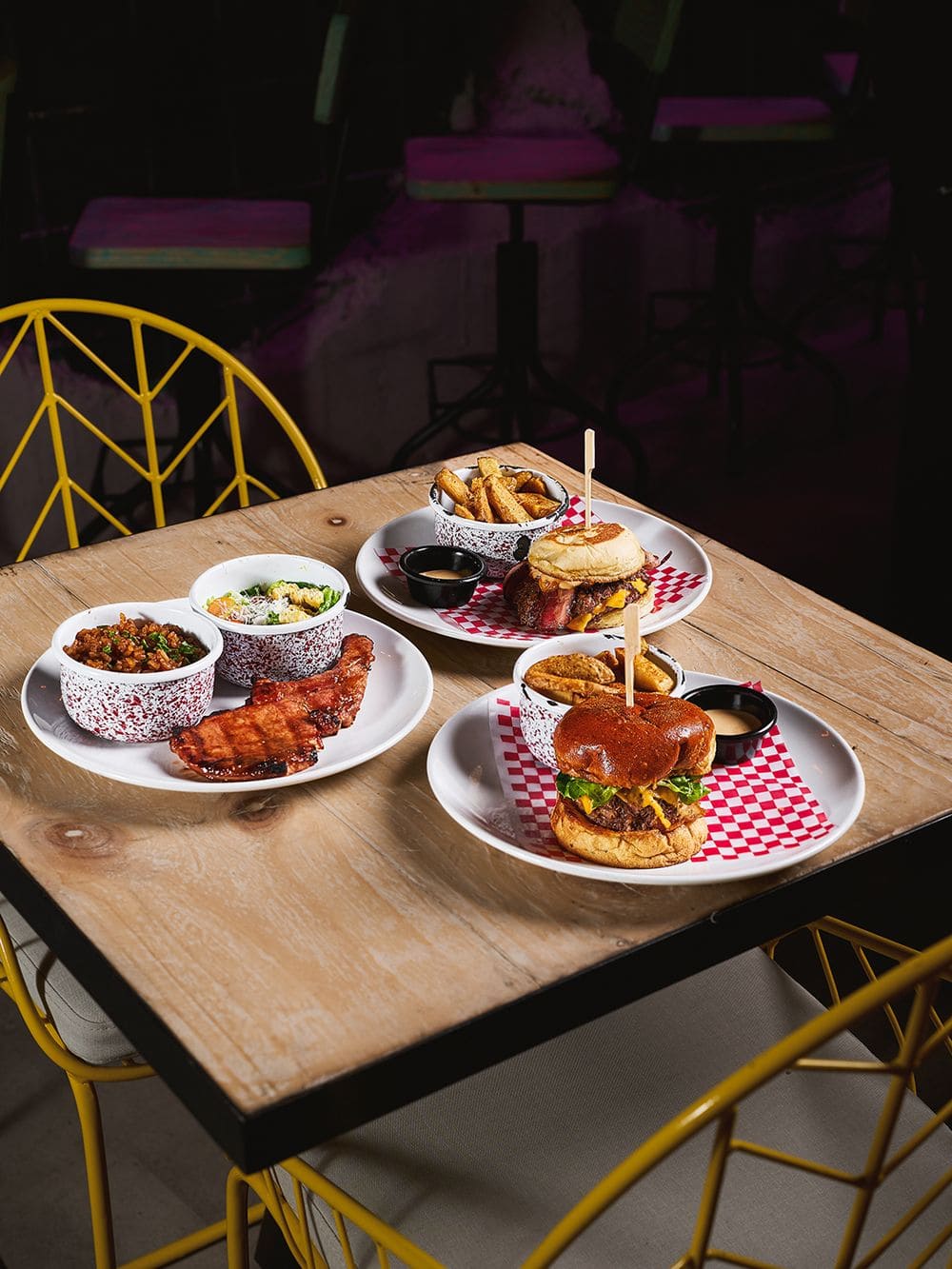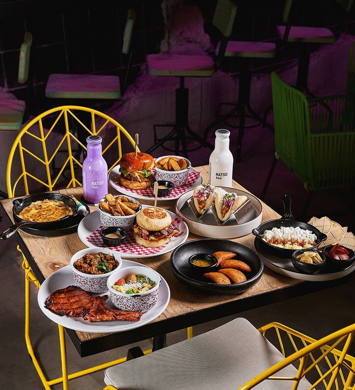 - Smash burguer: Doble carne smash con bordes dorados y crujientes, servida en suave pan bao, acompañada de mermelada de tomate cherry y romero, tocineta ahumada y salsa de la casa.
