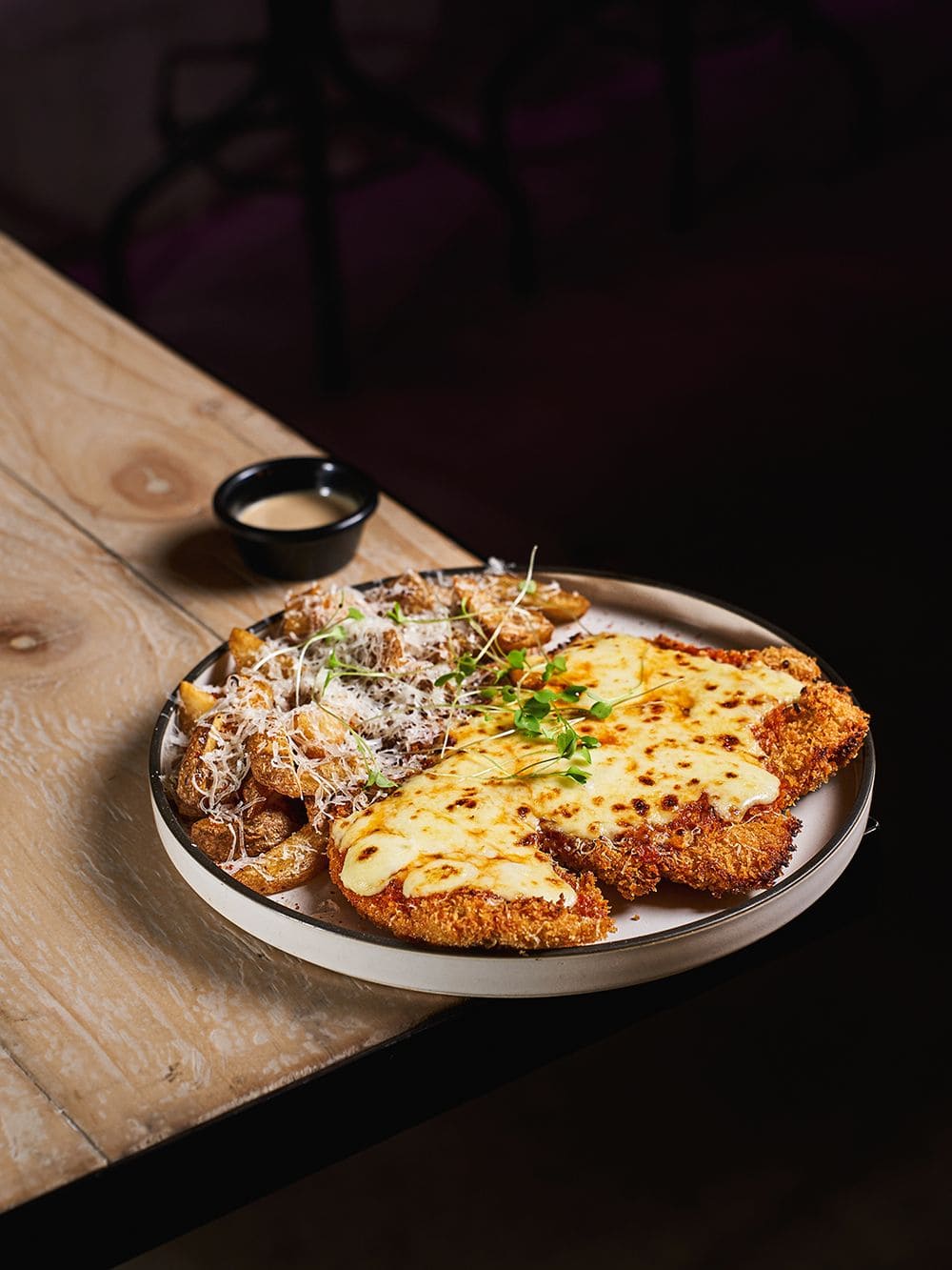 - Milanesa de pollo a la pizza: Crujiente milanesa de pollo marinada en cerveza, gratinada al horno con salsa pomodoro y queso fundido al estilo pizza. Servida con papas francesas y parmesano rallado.