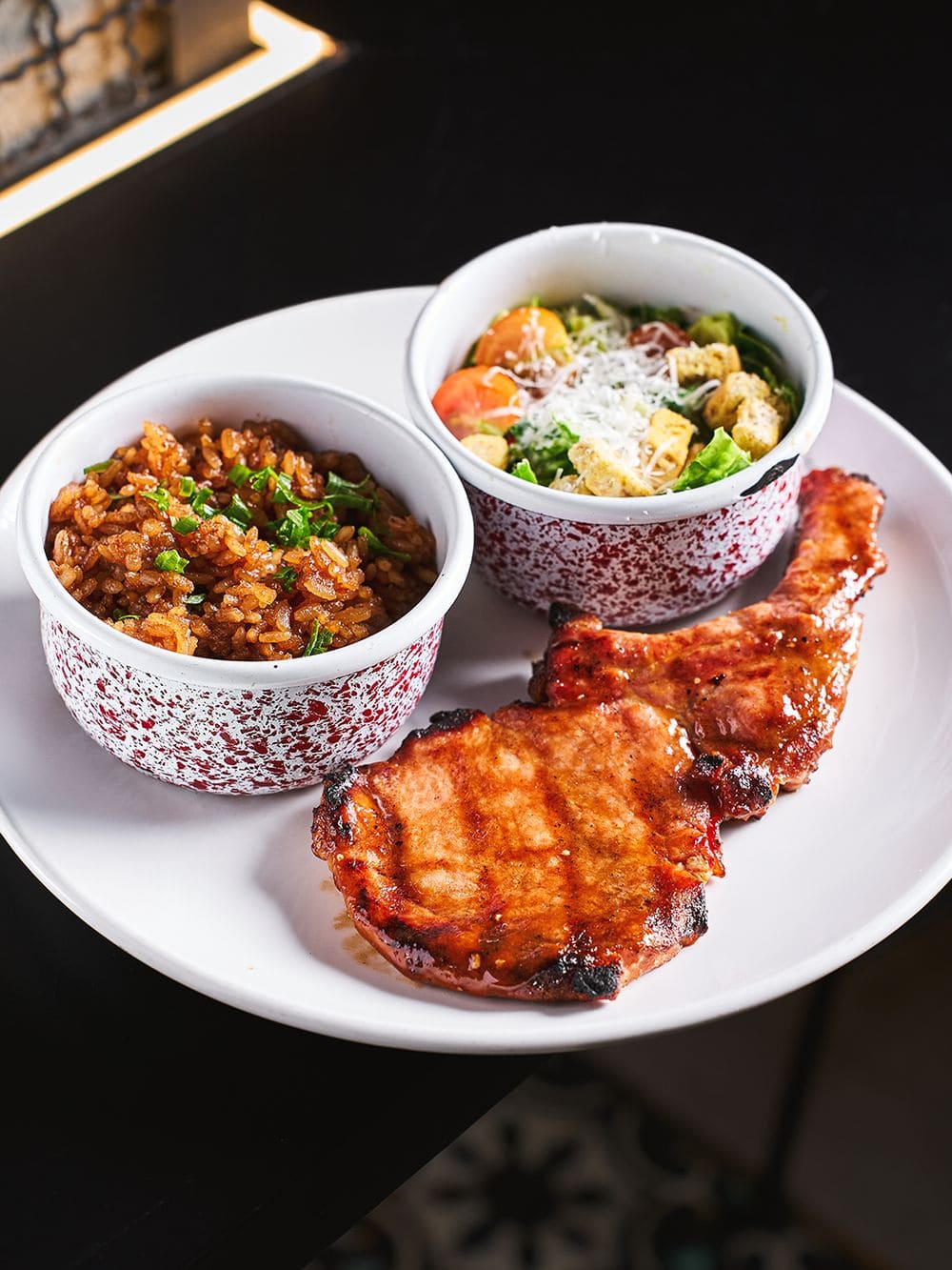 - Chuletón ahumado: Imponente corte de cerdo ahumado lentamente, de sabor profundo y textura jugosa que resalta el carácter de la parrilla servido con bbq de la casa y arroz titote