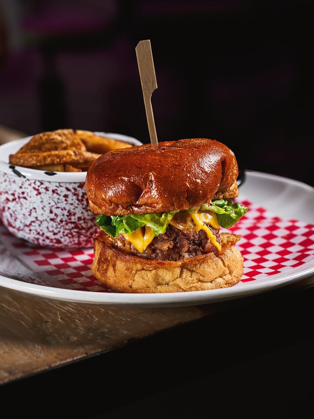 - Hamburguesa descomunal: Una jugosa hamburguesa rellena de mermelada de tocineta y mezcla de quesos, coronada con salsa de la casa y cogollo europeo fresco en pan brioche artesanal. Servida con papas a la francesa.