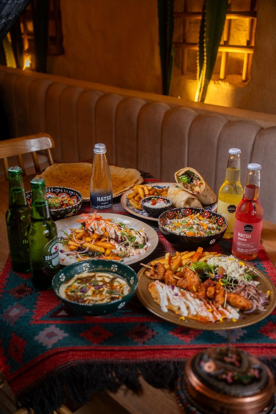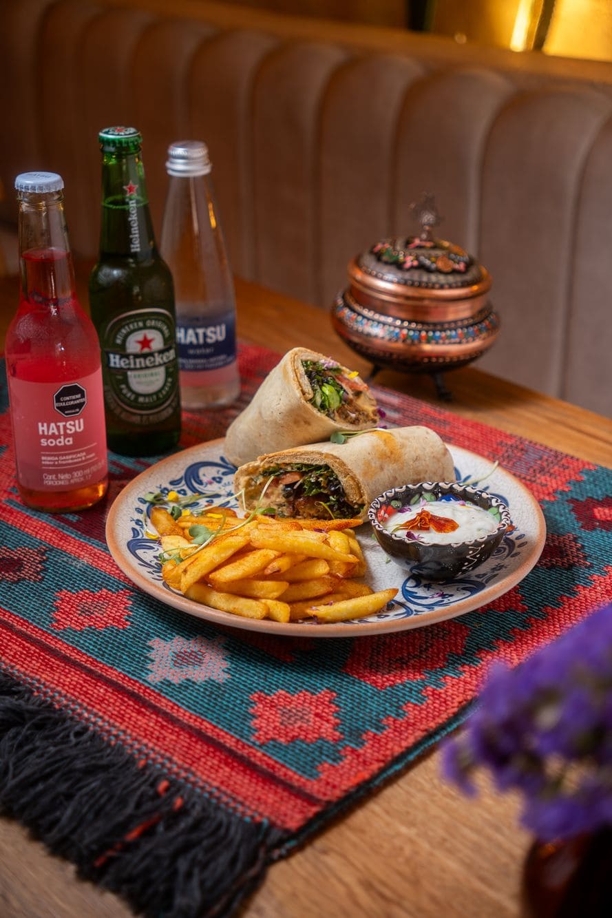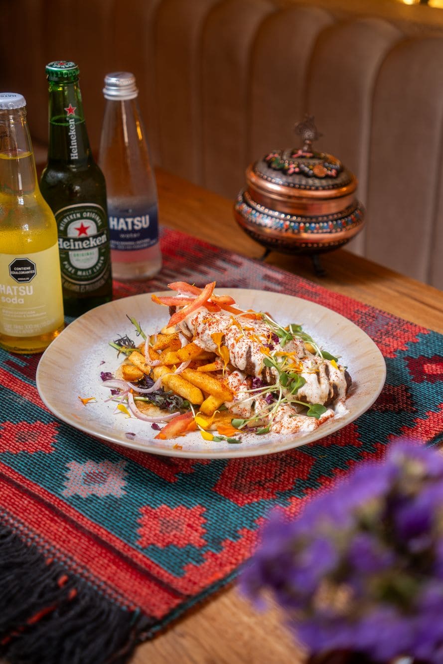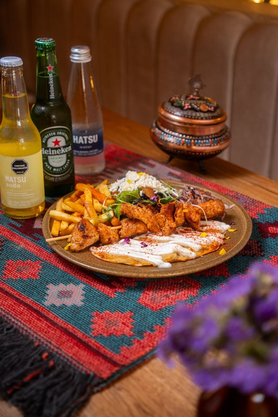 - Tavuv shish kebab: Brocheta de pechuga de pollo en trozos con adobo turco sobre pan naan, acompañada de ensaladilla griega, cebollas al sumac y papas a la francesa.
